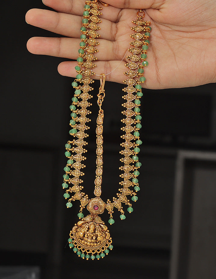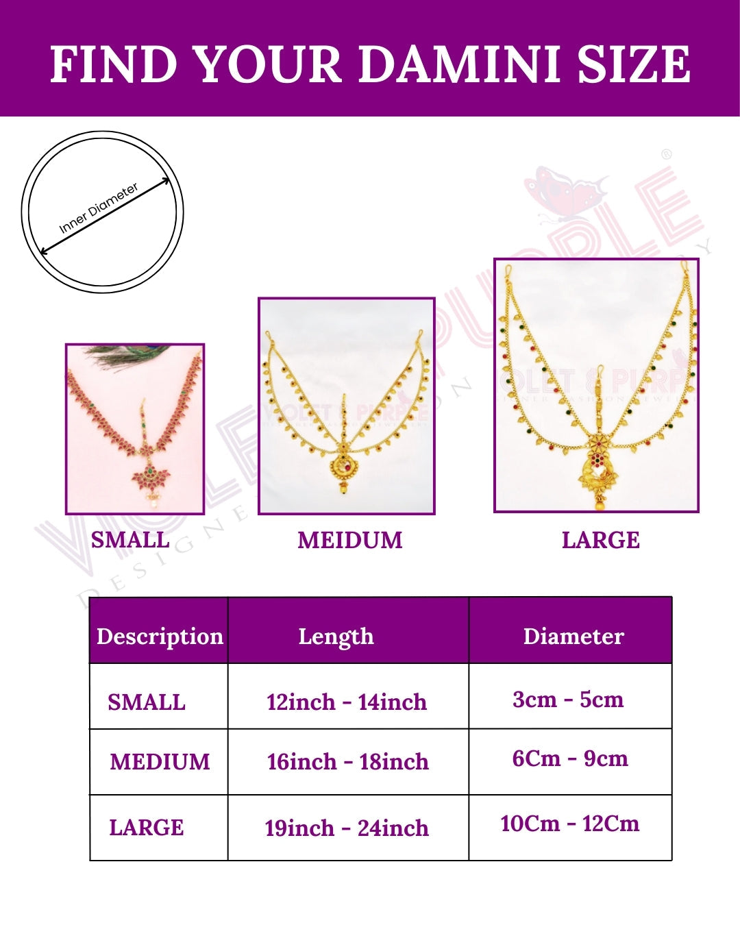 This beautiful Matt Damini-Maang Tikka is made of the highest quality metalwork and embroidered with dazzling Ruby & Emerald crystals attached. Its perfect for any traditional occasion, and makes a bold style statement with its eye-catching desi looks.