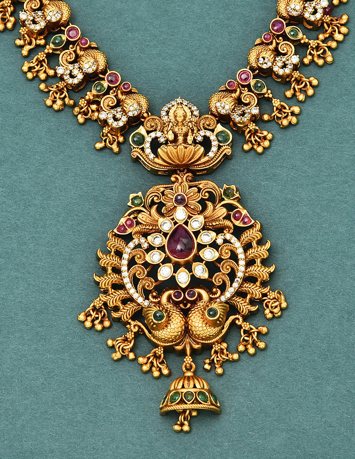 The Designer Matt Zirconia Necklace Set features a stunning peacock design, adorned with exquisite Ruby, Emerald, and white stones of Lakshmi Devi. Expertly crafted, this set is sure to elevate any outfit and make a bold statement. Experience luxury and elegance with this one-of-a-kind necklace set.