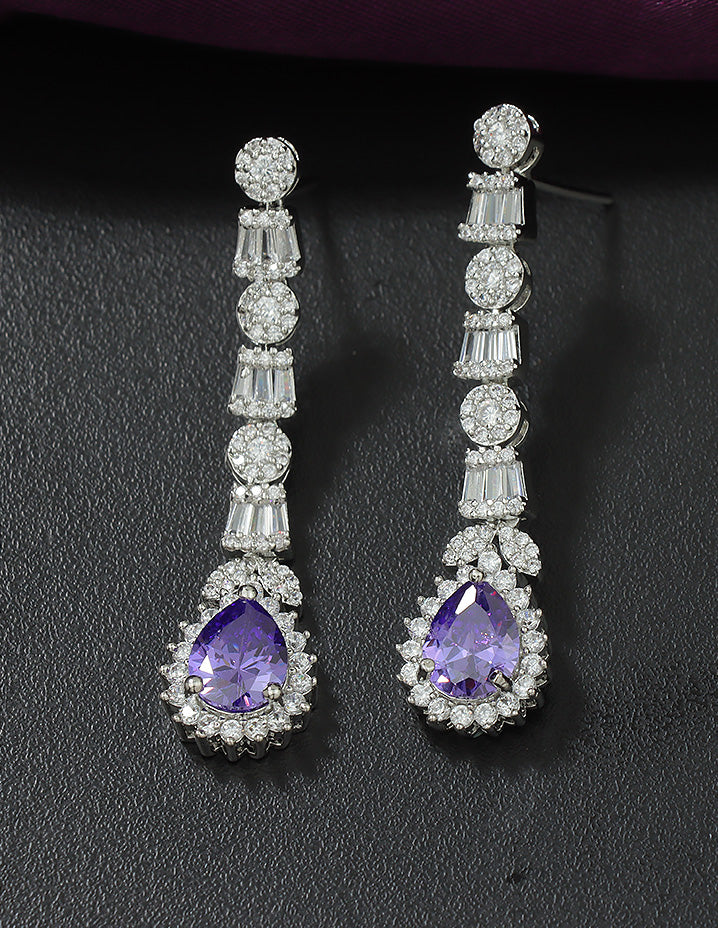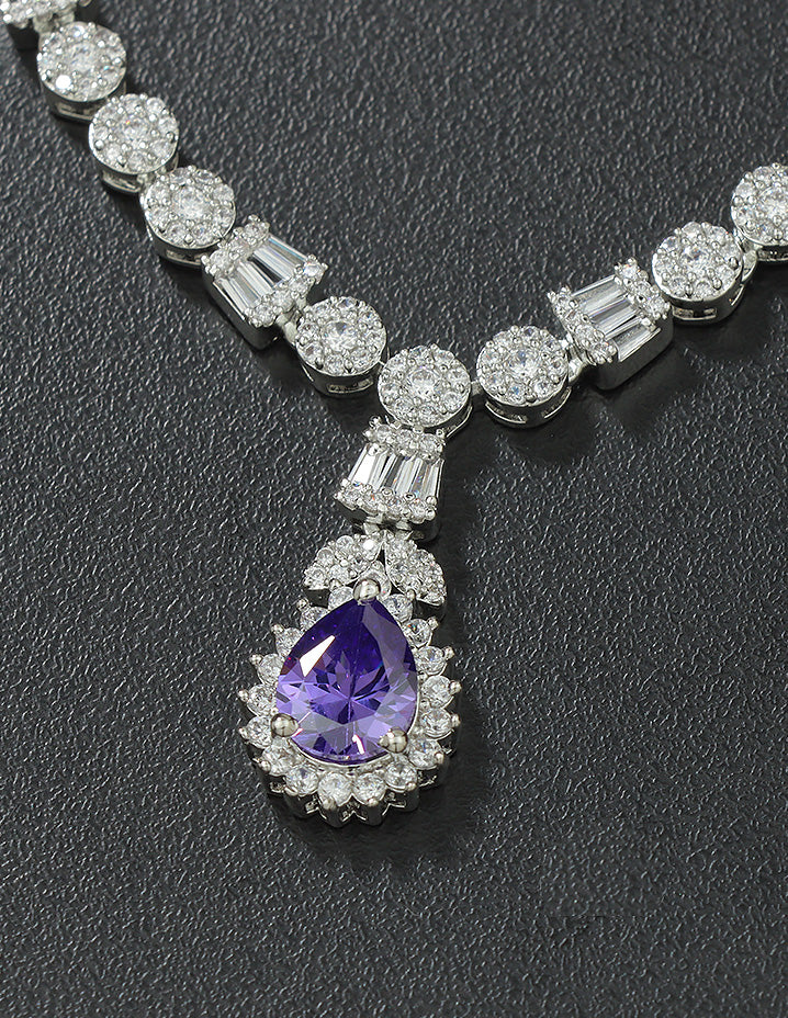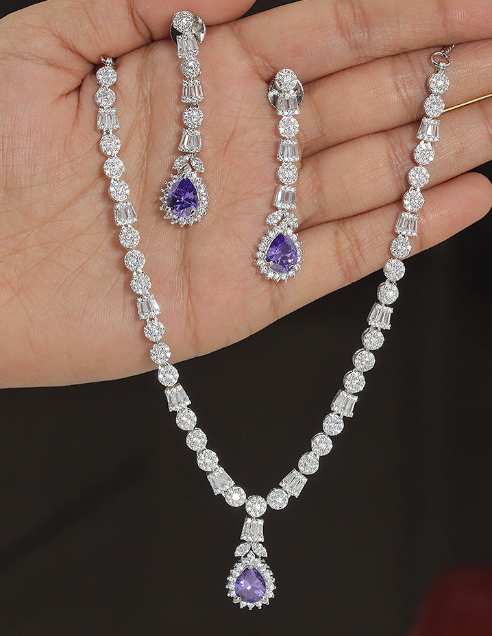 Turn heads with this Rhodium polish necklace set, featuring shimmering White and Amethyst AD stones for a classy touch. Perfect for elegant occasions, it adds timeless charm to any outfit.