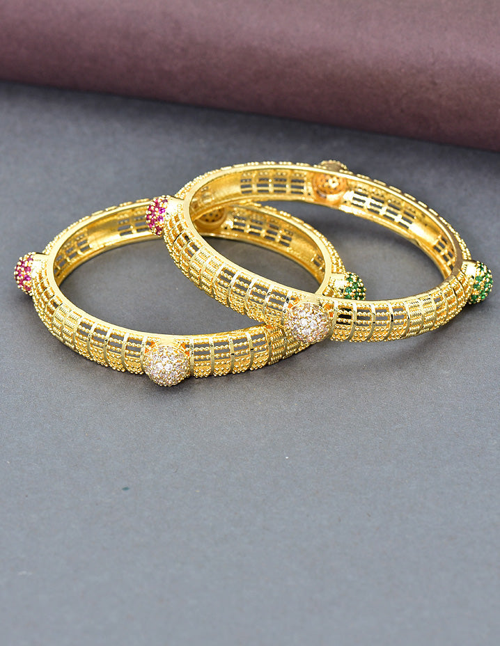Elegant and timeless, these Designer Zirconia Bangles feature ruby, emerald, and white stones with a rich gold polish. A perfect pair for formal and special occasions.