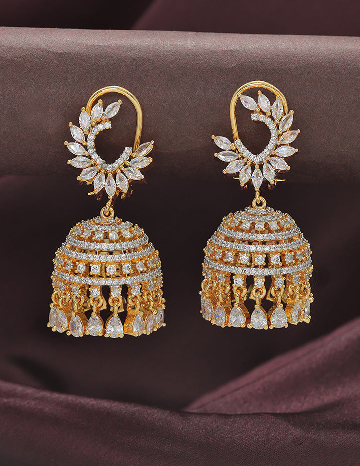 Designer earrings are classic jhumka-style danglers with a fusion of traditional and contemporary design. The bell-shaped drop is richly embellished with white stones and tear-drop dangles, paired with a sparkling oval top.