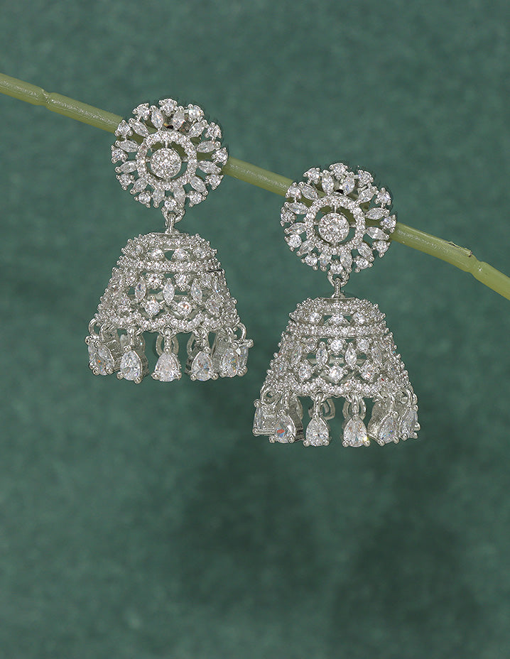 Designer earrings are classic jhumka-style danglers with a fusion of traditional and contemporary design. The bell-shaped drop is richly embellished with white stones and tear-drop dangles, paired with a sparkling oval top.