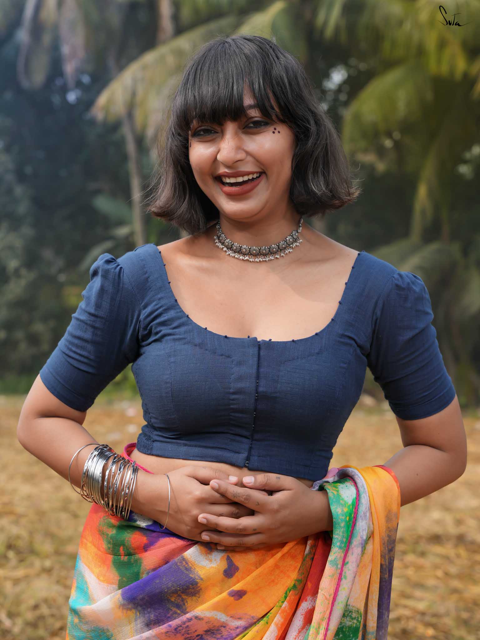 The model is wearing size S blouse and the saree is Dipped in Colours