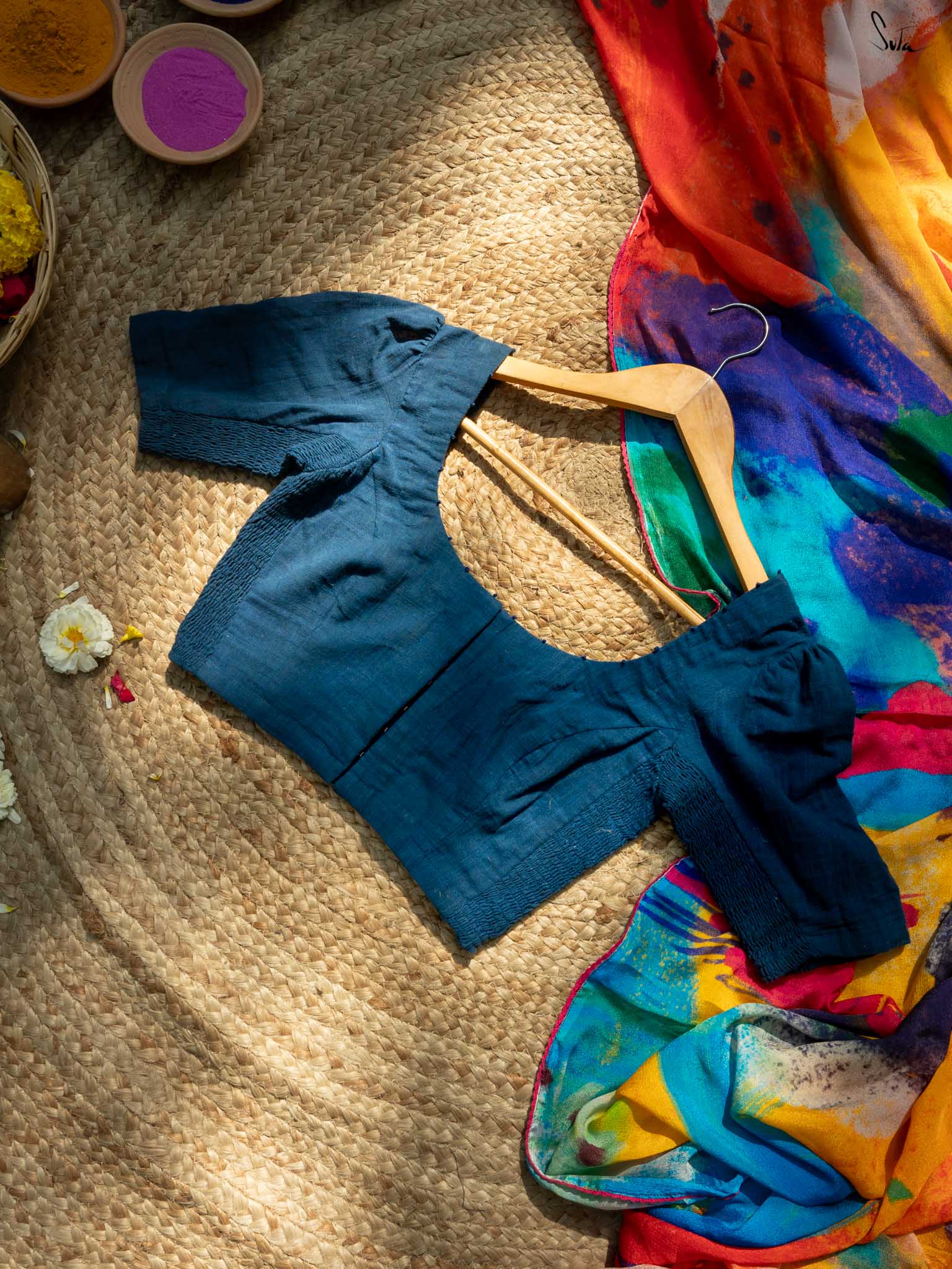 Timeless and graceful, this navy blue half-sleeved cotton blouse is your perfect partner for every Holi. The delicate French knot embroidery speaks of effortless charm, while the sleek U-neck and front hook opening make it as easy to wear as it is stunning. The Elas-Tech fit stretches to hug your body in a perfect fit, allowing you to move and revel in the festivities, wrapped in comfort and beauty. This blouse adapts to your movements, making you feel both stylish and at ease. For the ideal fit, we recommend shopping one size below, as it expands and molds to your body.