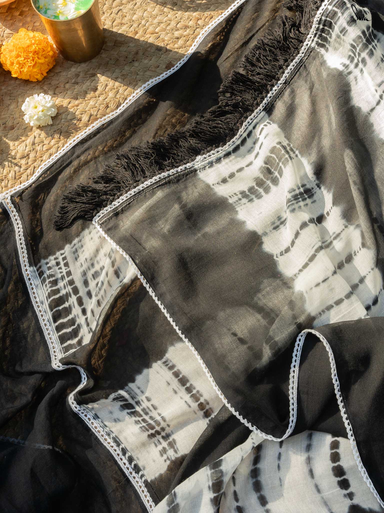 Under the moonlight, everything seems a little more magical like this black-and-white mul modal saree. Its tie-dye artistry and patchwork meet the quiet elegance of the night sky, where the stars shine in their subtle sheen. It’s a celebration of contrasts, dark and light, bold and soft capturing the essence of Holi when night falls, and the half half colors settle into the memories of the day. The lace, scalloped and soft, adds a celestial grace, while the jhalar tassels twinkle like stars in the night sky.
