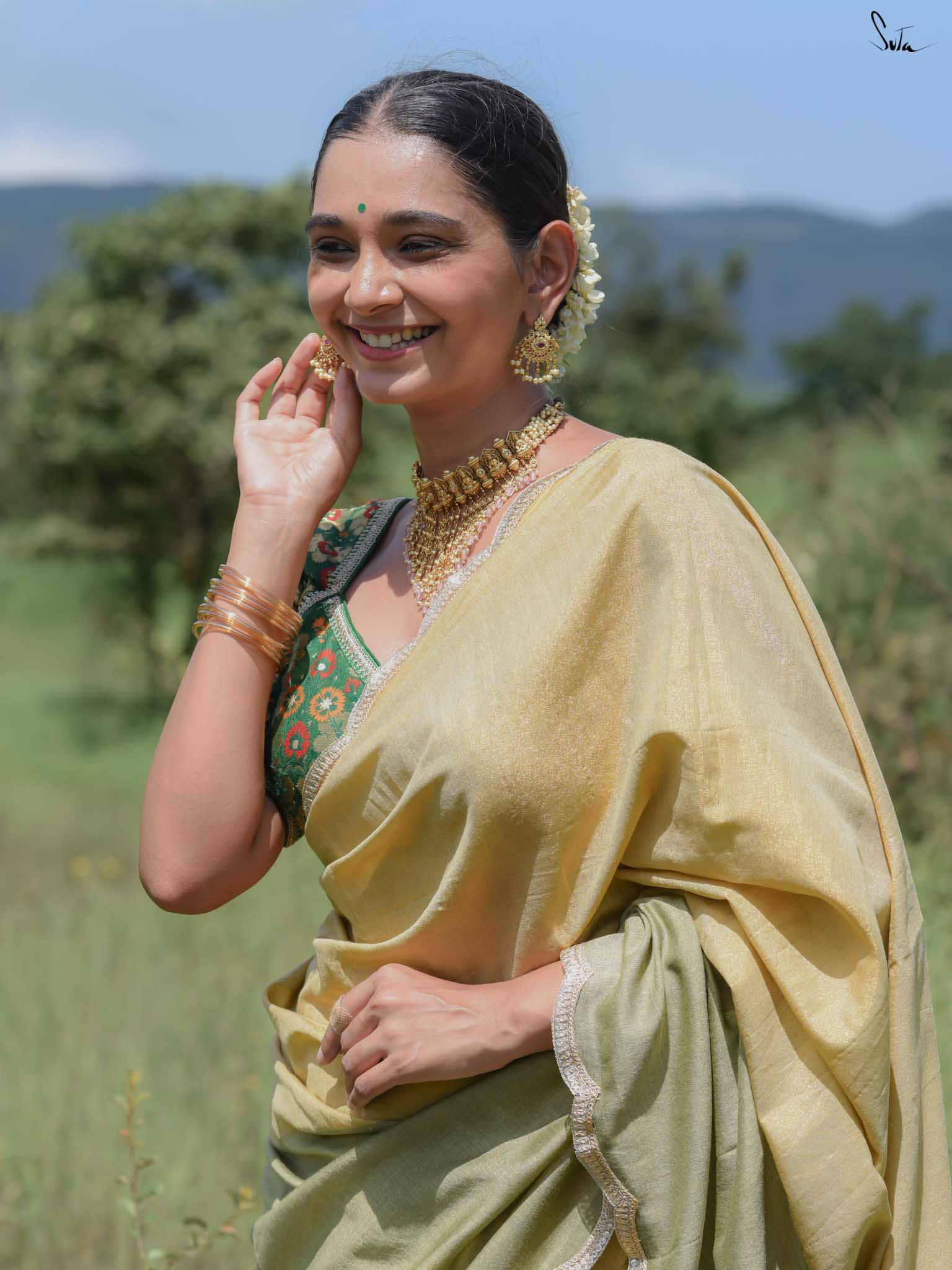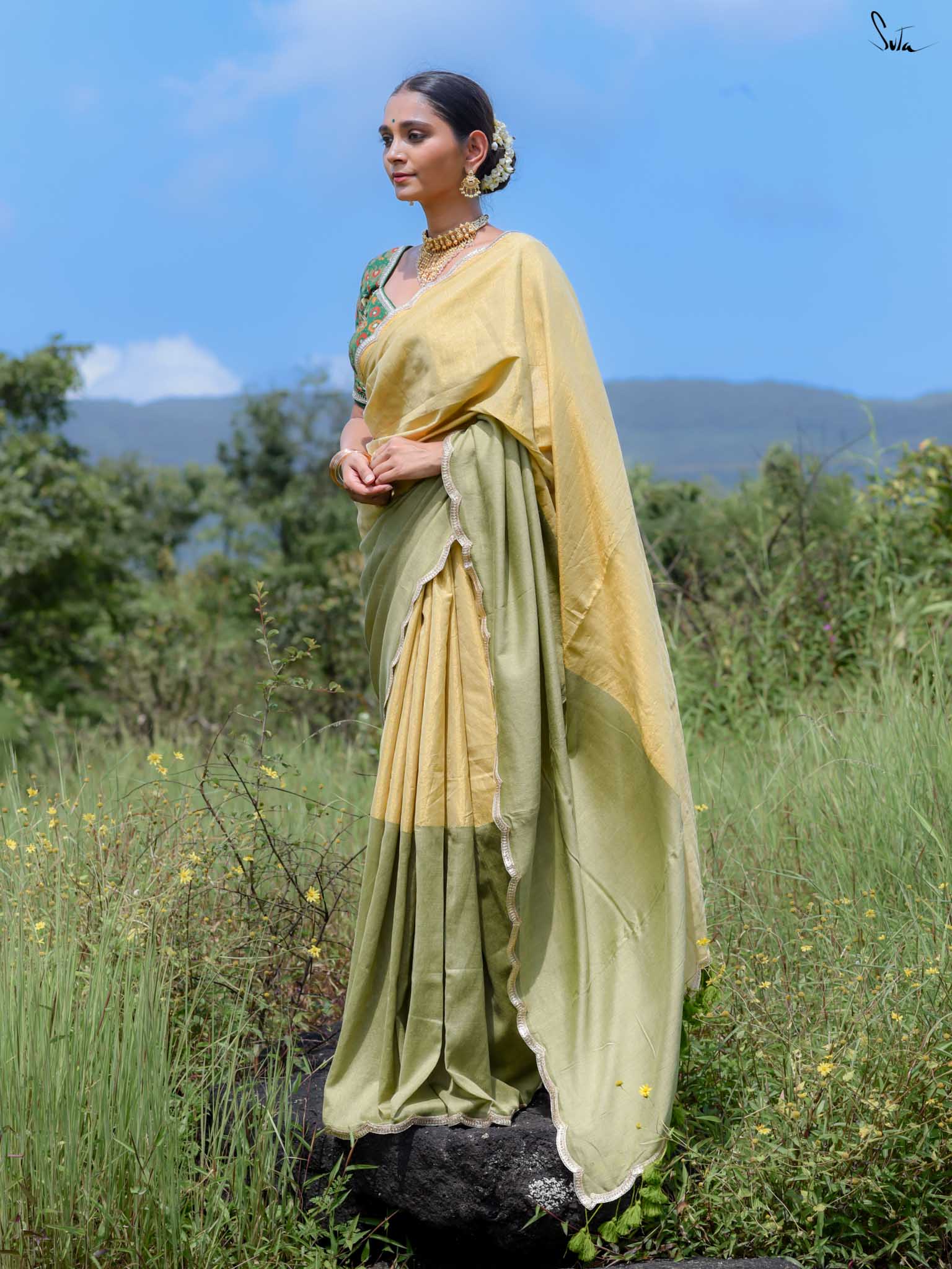 Soft, luminous, and full of grace, Dipped in Pistachio brings a refreshing twist to festive elegance. This cotton-acrylic saree features a beautiful half-and-half interplay of light green and gold zari, finished with a delicate gold scallop lace that adds a touch of regal charm. Woven with care, it’s the perfect drape for celebrations, weddings, or any moment that calls for subtle opulence.