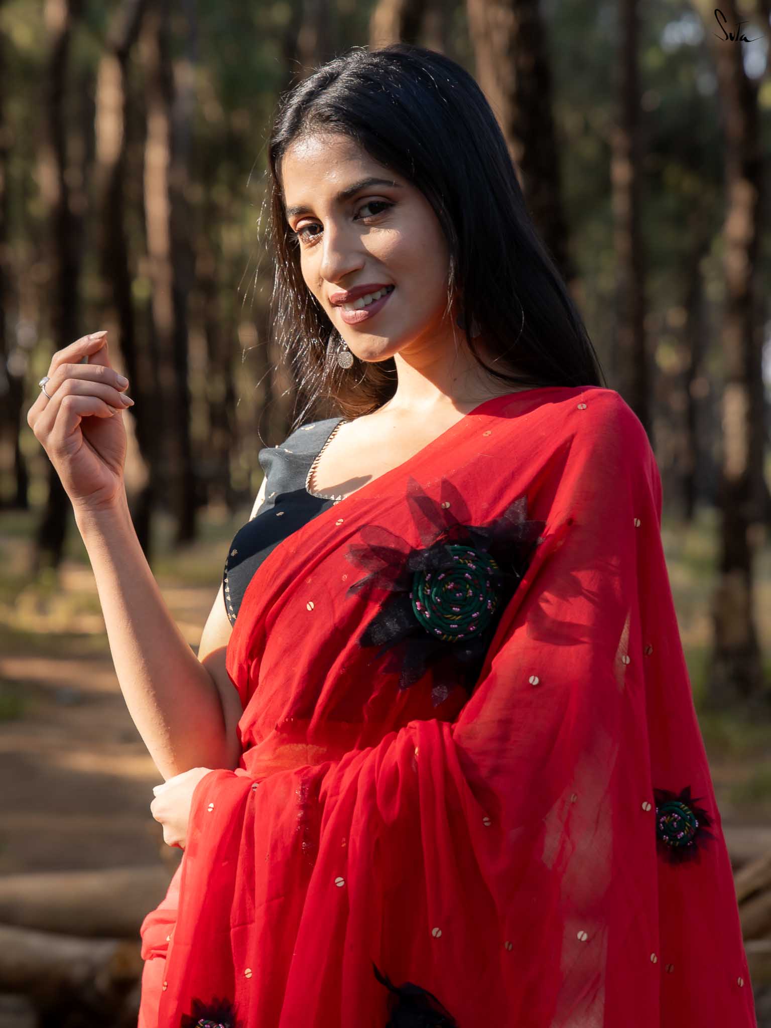 A hand-stitched 3D organza sunflower blooms gently along the drape, brought to life with intricate cording and placed with thoughtful artistry. It’s a motif that doesn’t just sit on the saree - it rises, glows, and adds a touch of handcrafted magic.