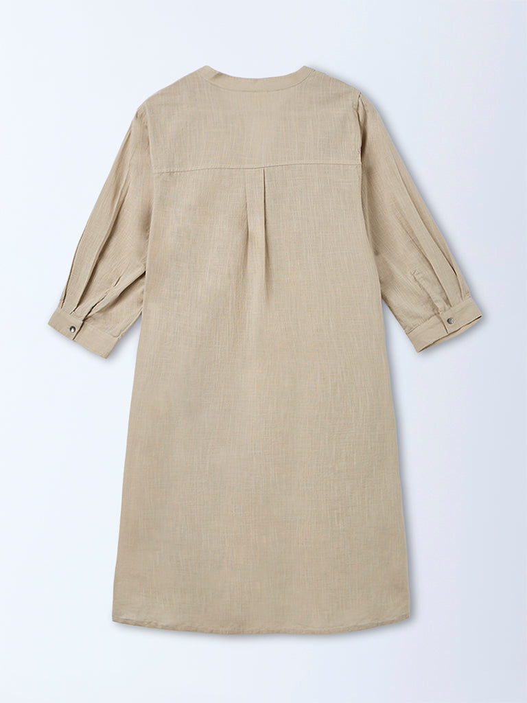 An easy choice for everyday ethnic wear, Diza presents this beige kurta detailed with striking botanical embroidery. Designed in a straight silhouette, it features a , mandarin neck, a button-up front and three-quarter sleeves for a balanced look. Milled from pure cotton fabric, it offers breathable comfort ideal for all-day wear.