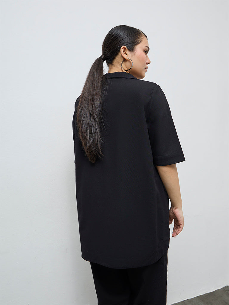 Embrace understated elegance with this black tunic from Diza, detailed with foliage embroidery at the front. Milled from a super-soft fabric, it drapes fluidly while staying comfortable through long festive hours. The spread collar and three quarter sleeves add a tailored finish that feels refined yet effortless.