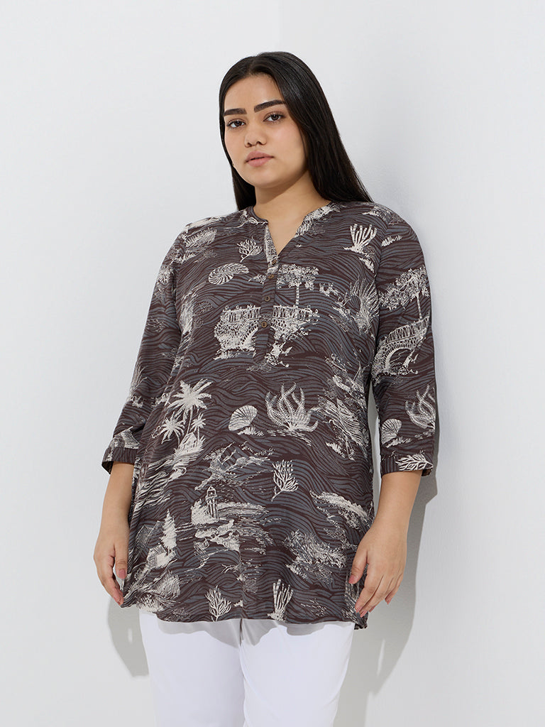 Diza launches this brown ethnic kurti, spun from a lightweight fabric for effortless daytime dressing. Showcasing scenic prints all over, it is designed with a mandarin neck, a brief button placket, and three-quarter sleeves, blending classic details with comfortable style.