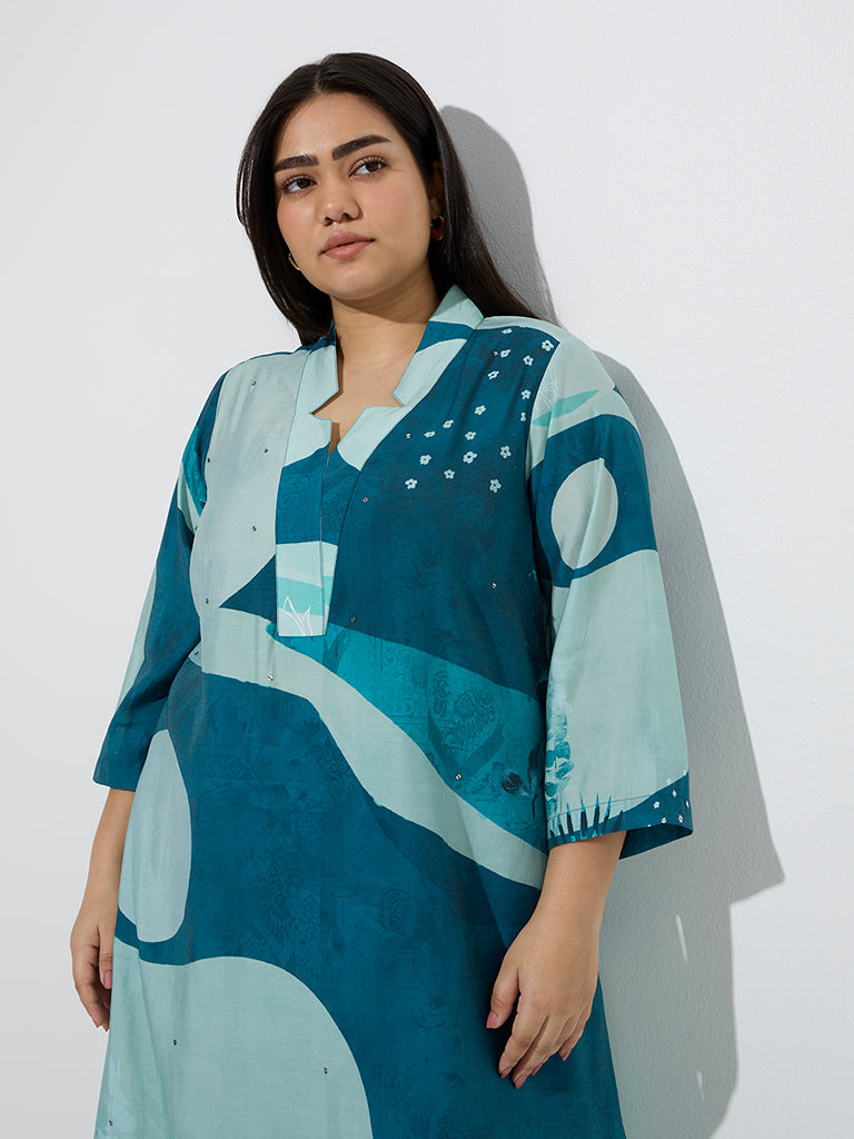 Defined with abstract prints, this teal kurta from Diza is sculpted in a flattering A-line silhouette. The lightweight fabric drapes effortlessly, while the asymmetrical neck and three-quarter sleeves add a modern touch. A discreet slip pocket enhances practicality, making this piece both stylish and functional.