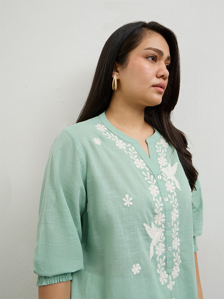 Diza presents this turquoise tunic featuring exquisite floral embroidery near the neckline and on the yoke, accentuating the design with a refined detail. The split neckline flows into a quarter-button placket with three-quarter sleeves that add an artisanal charm. Crafted from pure cotton, the fabric offers all-day comfort and a soft feel.