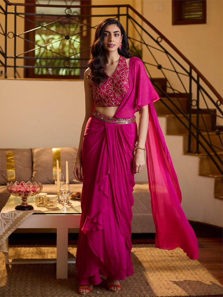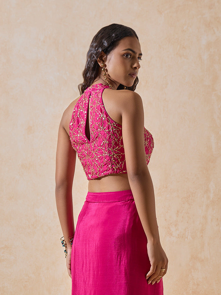 Update your traditional wear with this pink blouse. Encrusted with intricate sequin details all over for added sophistication, this sleeveless blouse is designed with a V-neckline as well as a keyhole detailing at the back for added chicness.