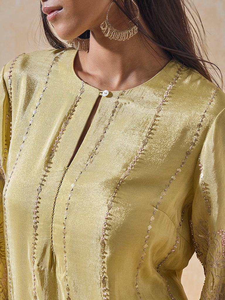 This yellow kurti is designed to bring festive polish in the most effortless way. The fabric shimmers softly, decorated with sequinned accents that add quiet glamour. Floral embroidery along the flared sleeves and hem creates texture and intricacy, making it a versatile choice for evening gatherings.