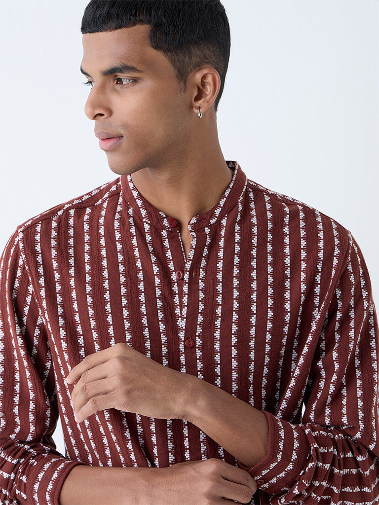 Effortlessly refined, this brown resort-fit shirt from ETA is designed for the modern man’s off-duty moments. Spun from pure cotton, it’s detailed with embroidery that adds subtle texture. The band collar, full sleeves, and clean button placket strike the right balance between laid-back and polished.