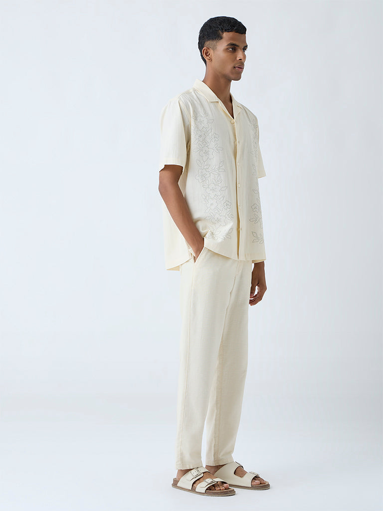From brunch to after-dark events, this cream shirt from ETA adapts to every moment with ease. Crafted from a cotton-rich fabric, it showcases delicate floral embroidery on a relaxed silhouette. Styled with a camp collar, button placket, and short sleeves, this stylish piece blends smart-casual sophistication with effortless ease.
