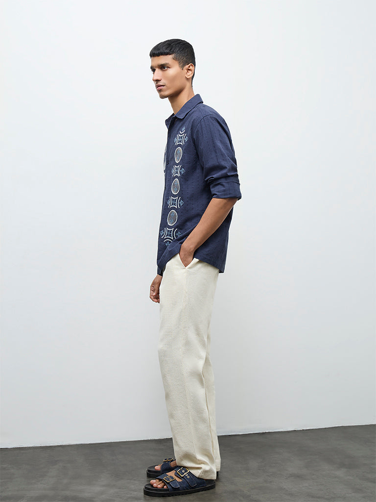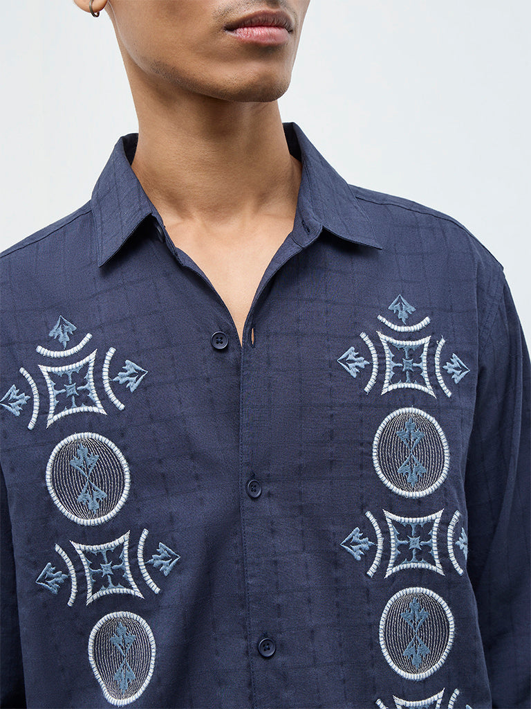 ETA Navy Embroidered Relaxed-Fit Cotton Shirt