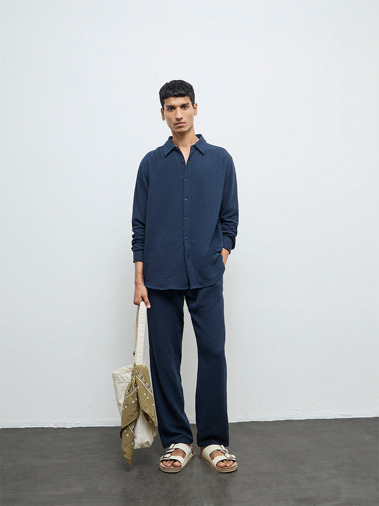 Move through the day in understated style with this navy shirt from ETA, designed in a crinkle-textured fabric for a lived-in, relaxed feel. Featuring a classic collar, button placket, and full sleeves with buttoned cuffs, it is a versatile piece that works from casual outings to off-duty plans.