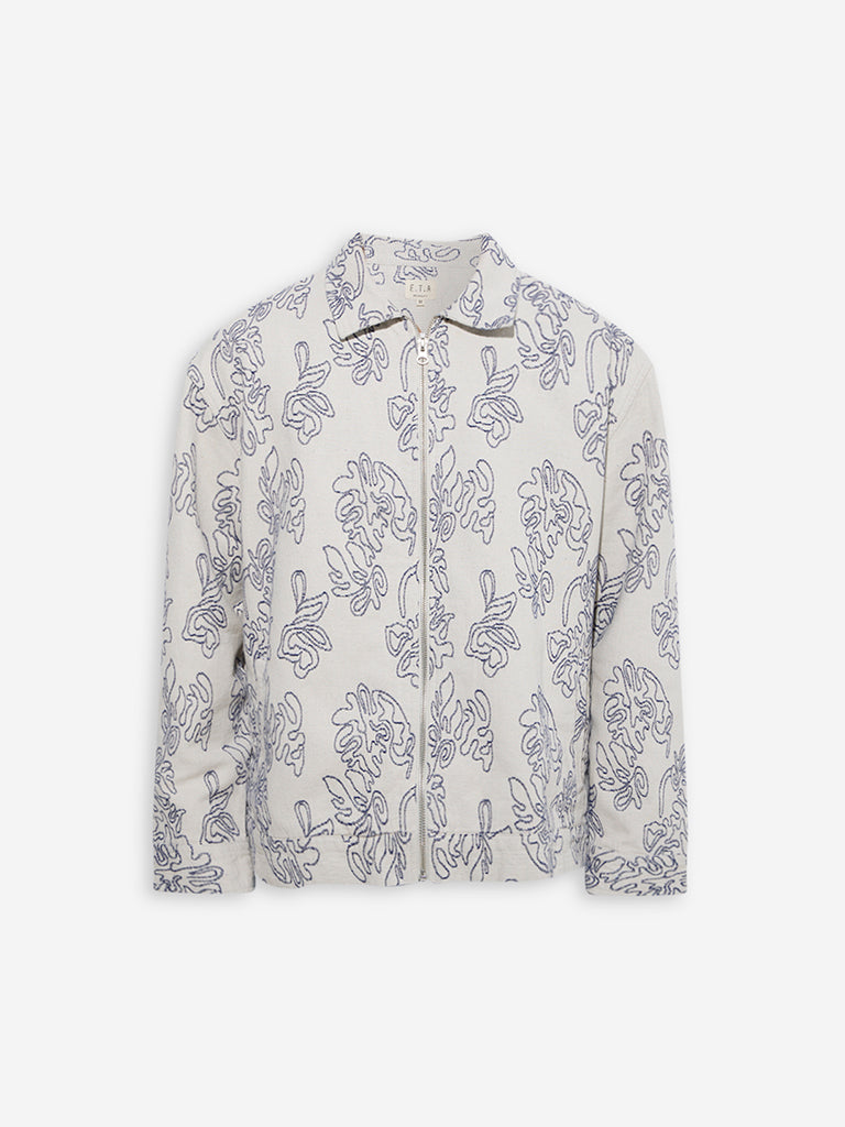 This off-white jacket from ETA stands out with trendy abstract prints across its relaxed-fit silhouette. Spun from pure cotton, it features a spread collar, zipper placket, and full sleeves, offering both comfort and statement style.