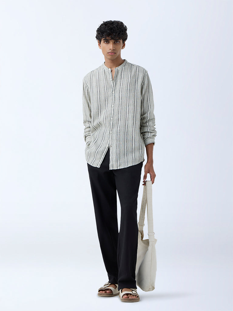 This sage shirt from ETA is decked with stripe embroidery that adds understated depth to its design. Woven from a knit-textured fabric and cut in a resort-fit silhouette, it is styled with a band collar, full sleeves, and a button placket for ease of wear.