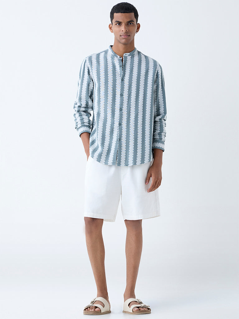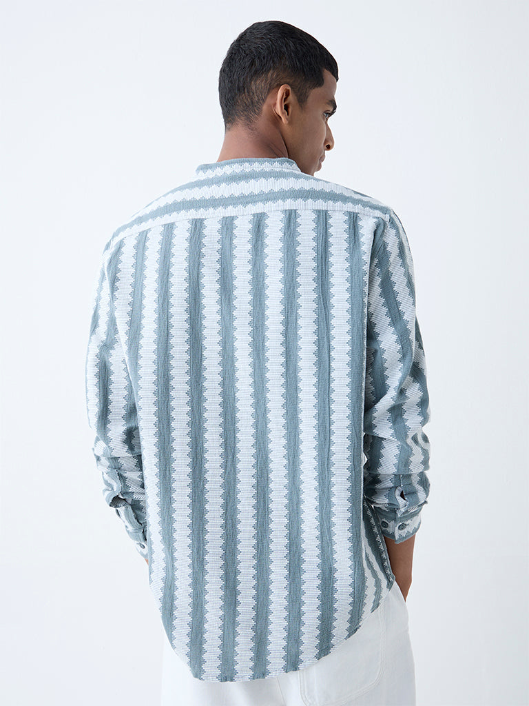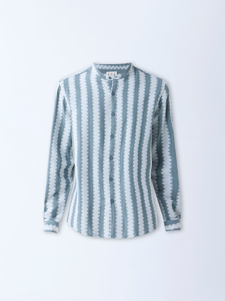 This teal resort-fit shirt from ETA makes an understated statement. Spun from pure cotton, it is defined with intricate embroidery throughout. The fluid silhouette is framed by a band collar, full sleeves, and a minimal button placket.