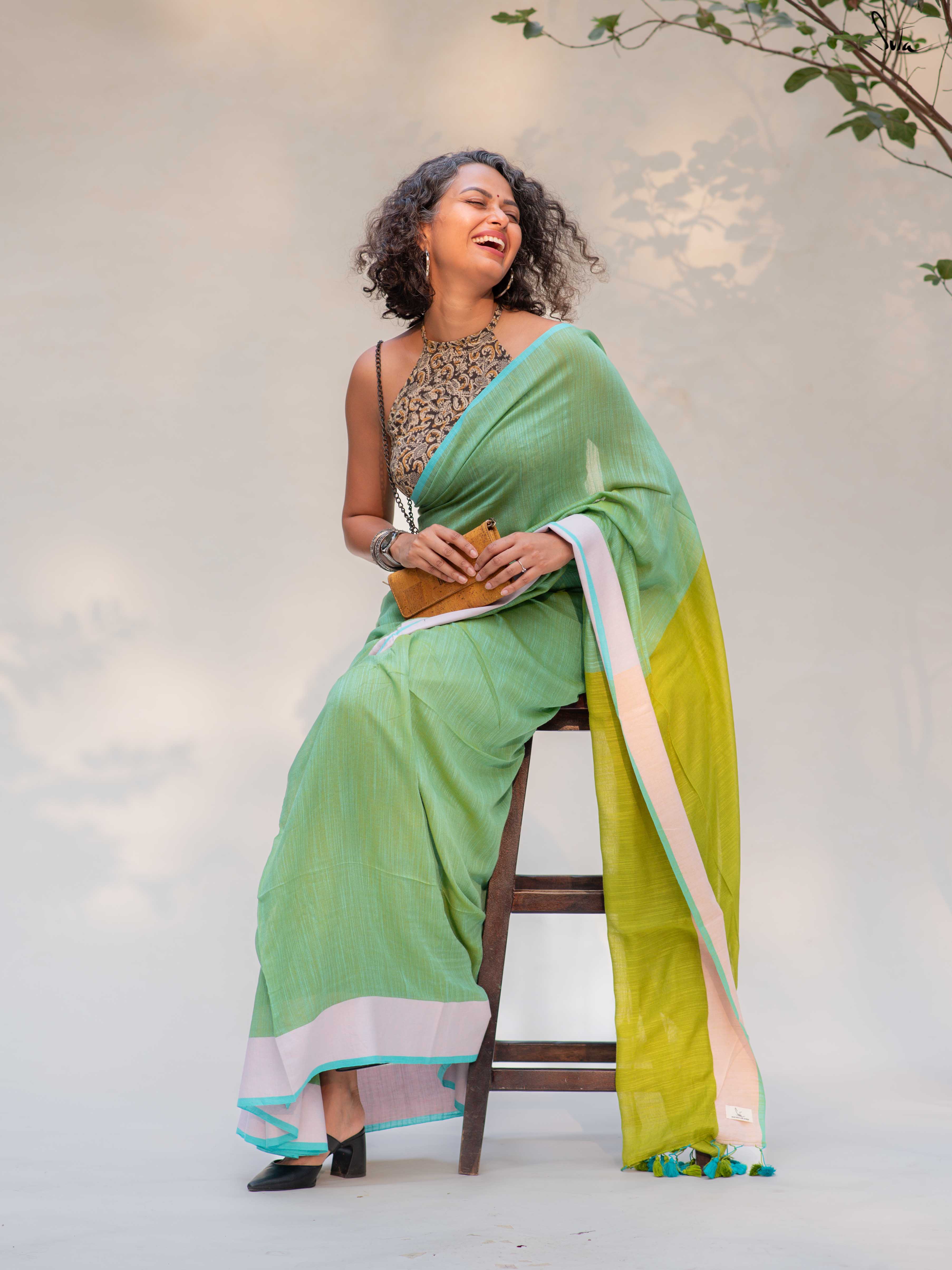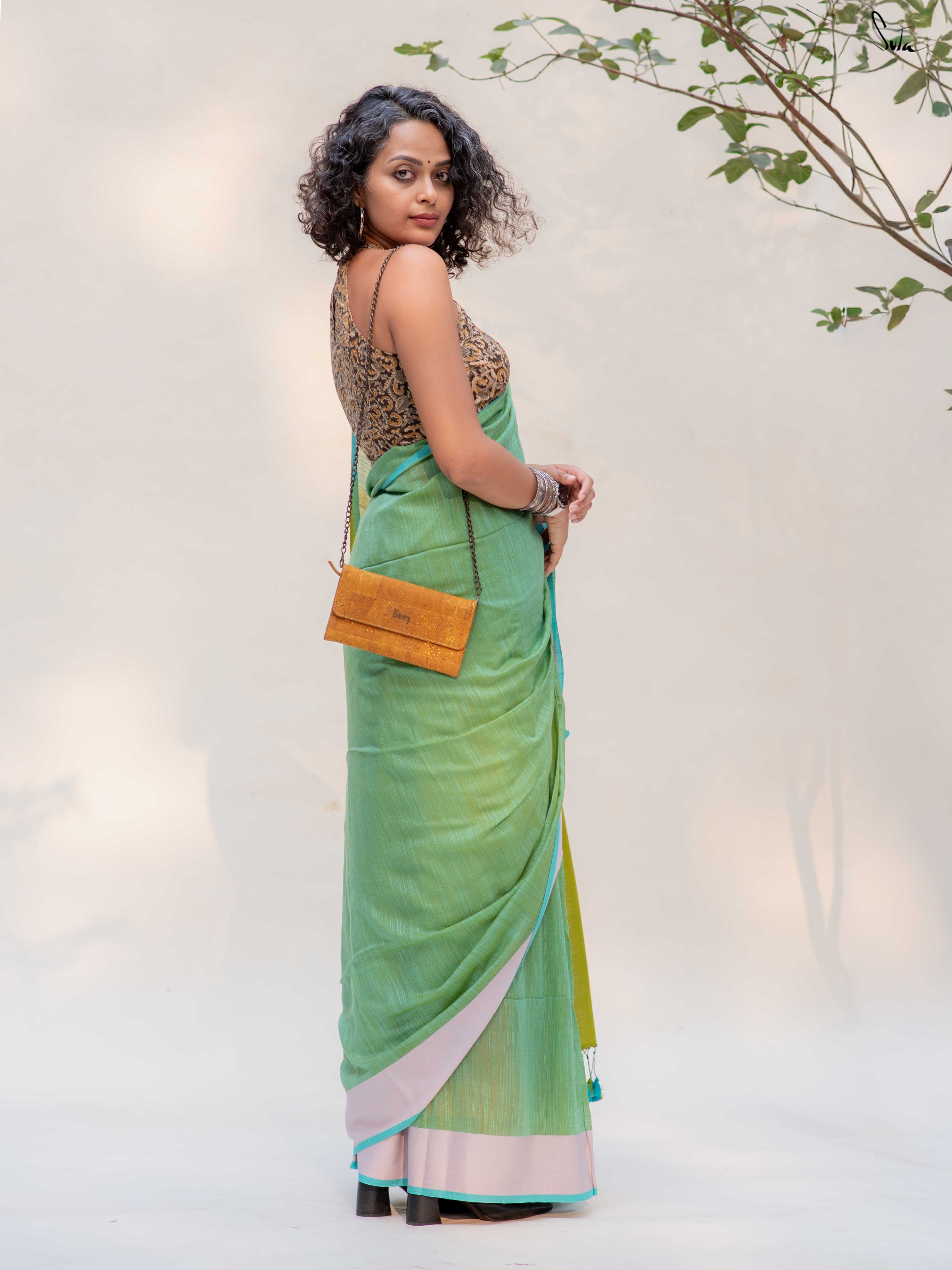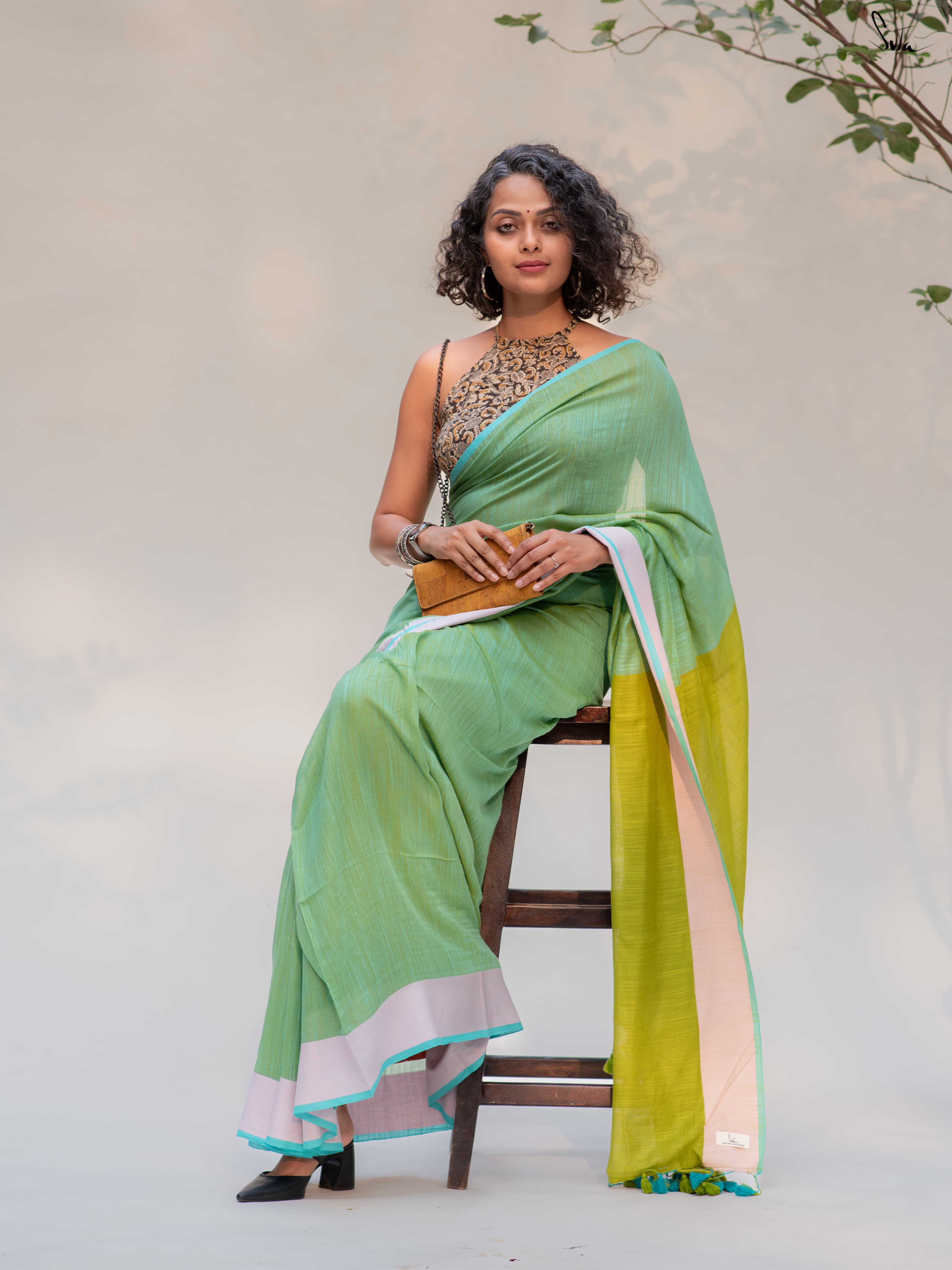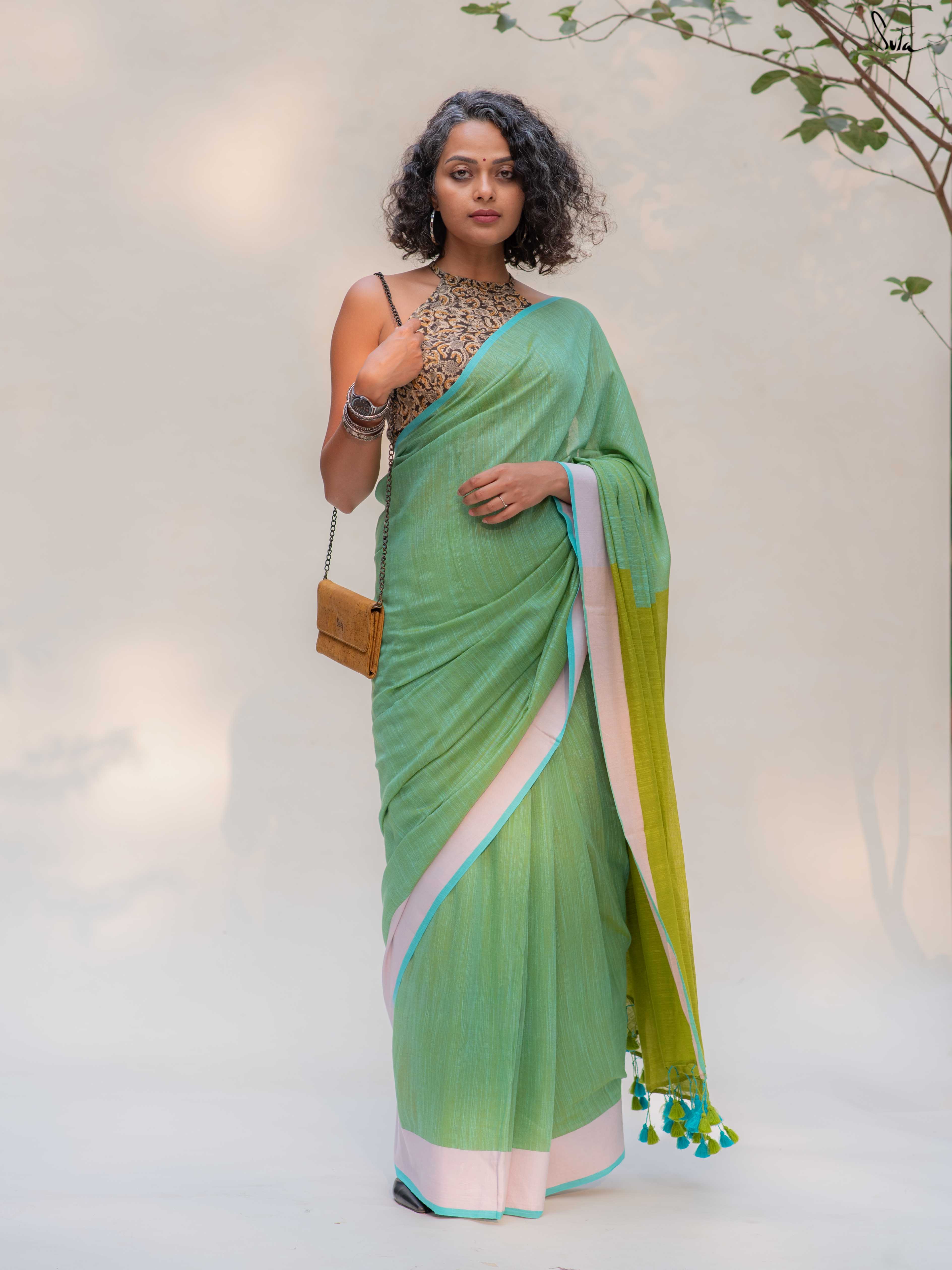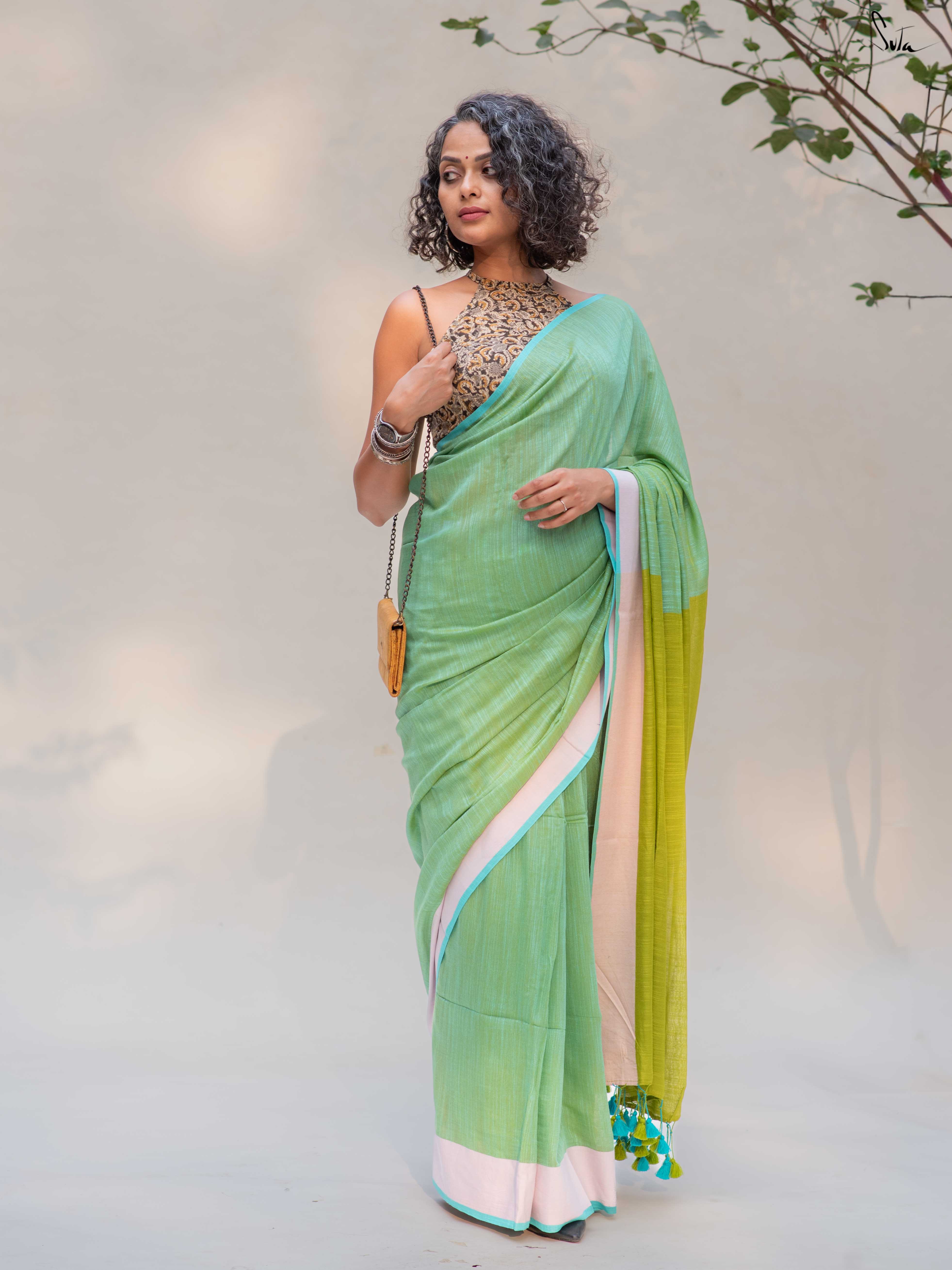 Fresh, light, and quietly playful - Fennel Phool feels like a soft summer breeze. Crafted in breathable cotton, this pista green saree is framed with a pale pink border that adds a gentle blush, while the contrast lime green pallu brings in an unexpected pop.