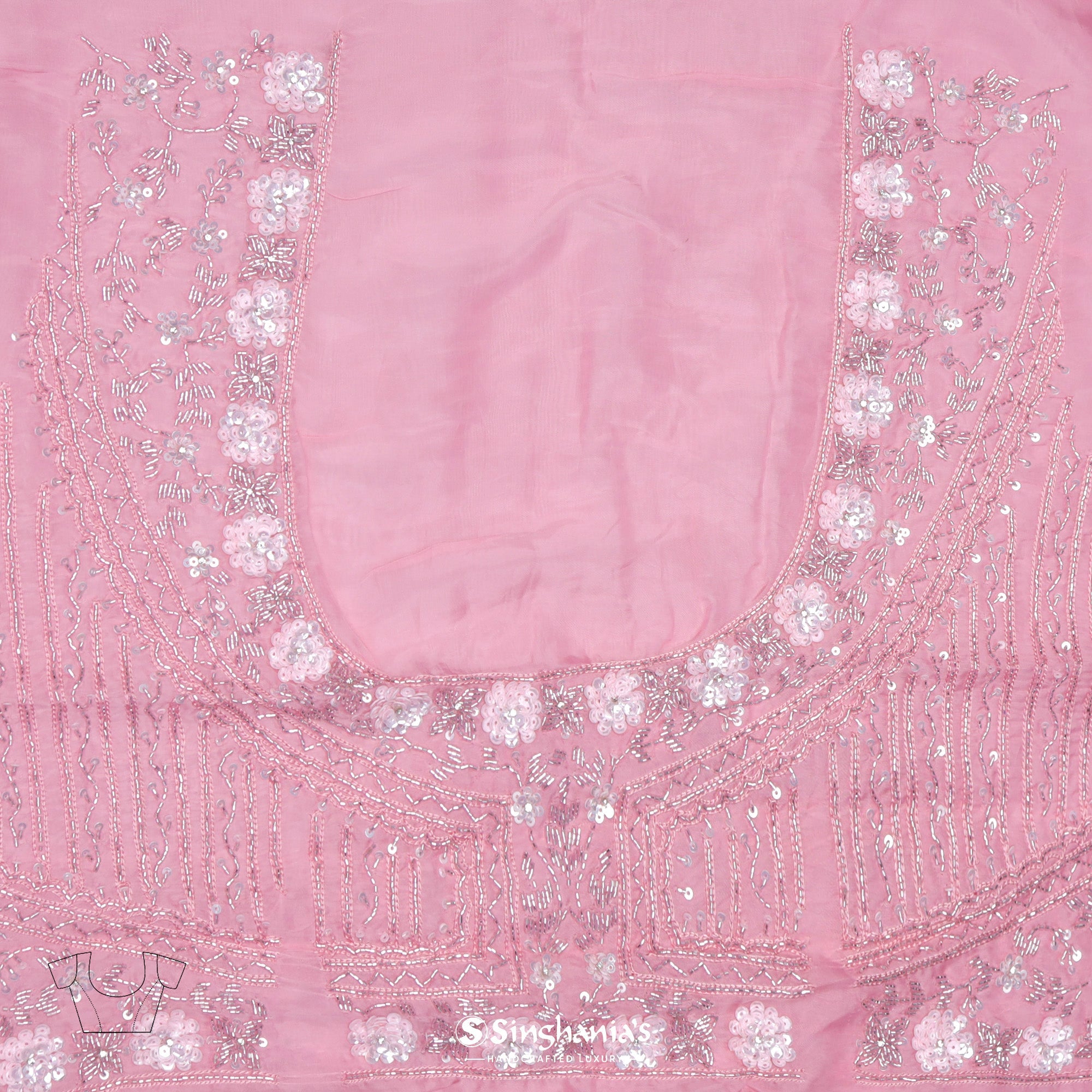 A flamingo pink saree with organza base, features a solid colour body that creates an overall simplicity charm. Adorned with small and intricately embroidered floral pattern border that adds to the look. Perfect for outdoor, festive occasions, etc.