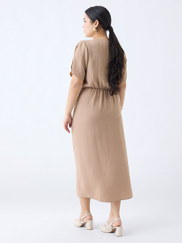 Redefine your nine-to-nine wardrobe with this beige dress from Gia. The minimalistic silhouette gives a flattering frame courtesy the bow detail in the front while the subtly flared sleeves give a stylish sign-off.