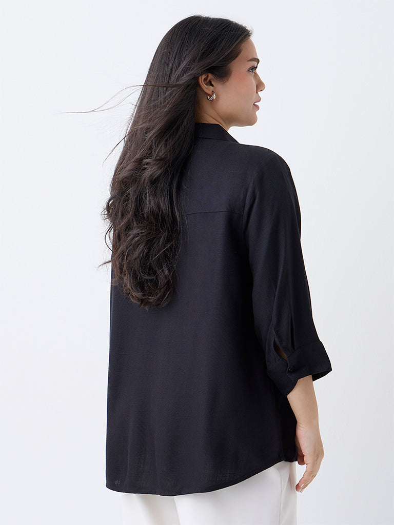 This black shirt from Gia blends breathable comfort with elevated detailing. Floral embroidery lends a timeless yet modern charm, while the soft fabric drapes gracefully without clinging. Designed with a collar and button placket for structured polish, and three-quarter sleeves for added coverage, it is a versatile piece that flatters curves effortlessly.