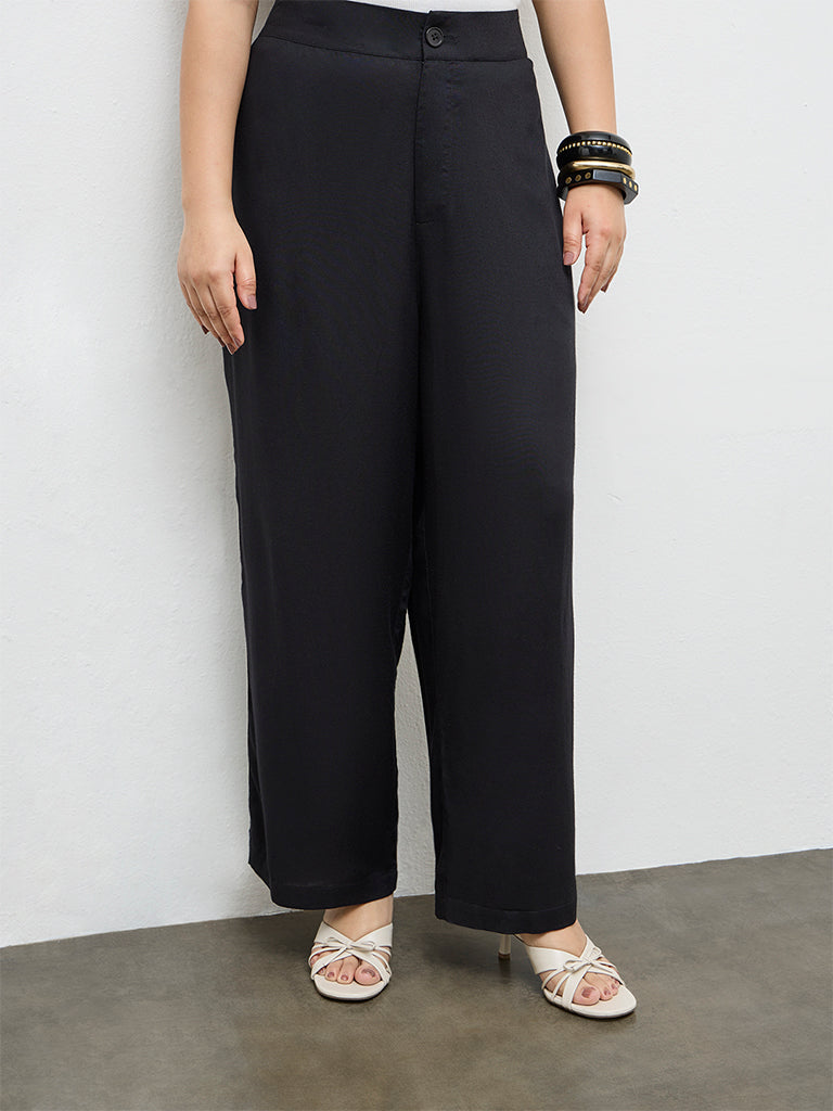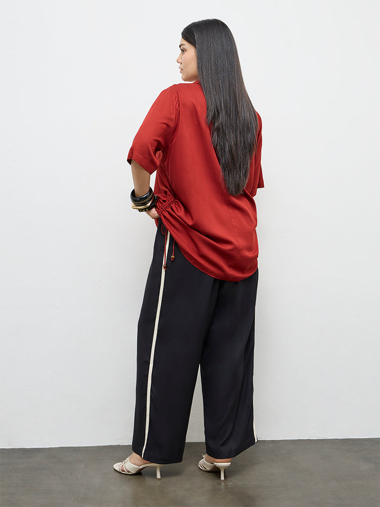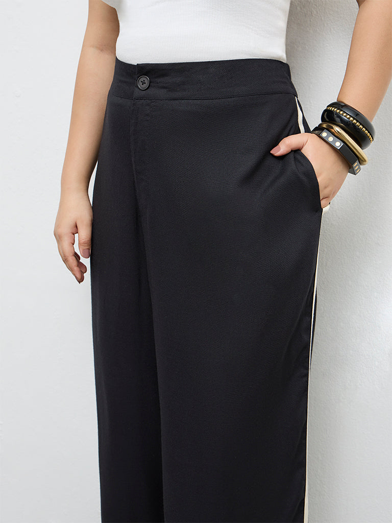A reliable choice for everyday styling, these black trousers from Gia are designed in a high-rise waist. Showcasing stripe-details running along the sides, it is fitted with a button closure, a zipper placket and an elasticated waistband at the back for ease of wear. The lightweight fabric construction feels light on the skin while the side pockets completes the design with a functional element.