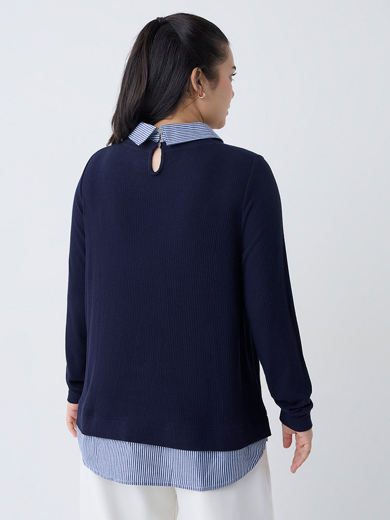 This navy t-shirt from Gia blends comfort with a polished twist. The ribbed fabric offers soft stretch, while the shirt-style striped collar adds a crisp contrast. A button-loop closure at the back completes the look. With full sleeves for added coverage and coziness, it’s your go-to for days when you want casual ease with a refined edge.