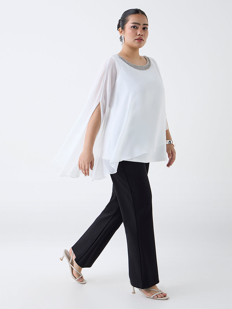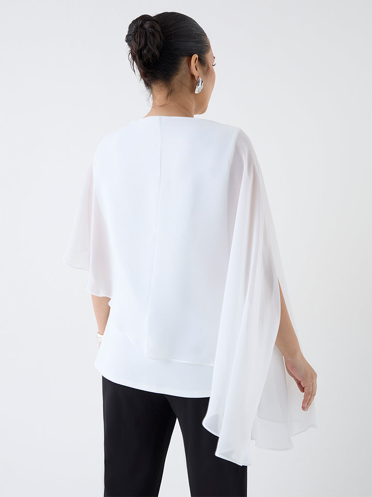 This white top from Gia features a flowing cape-style overlay that drapes elegantly over the arms. The neckline is highlighted with silver-toned embellishment for a refined touch, while the smooth inner layer ensures comfortable coverage. A polished piece ideal for evening and festive dressing.
