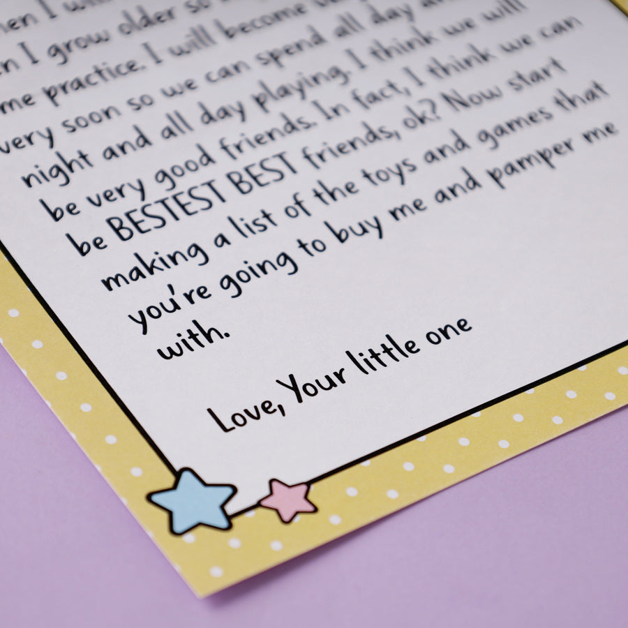 Letter for New Dad - Want to surprise a new dad who can’t stop being excited about the baby? Gift him an outrageously cute letter written by his little baby! This gift is adorable enough to make him melt like a slab of butter.