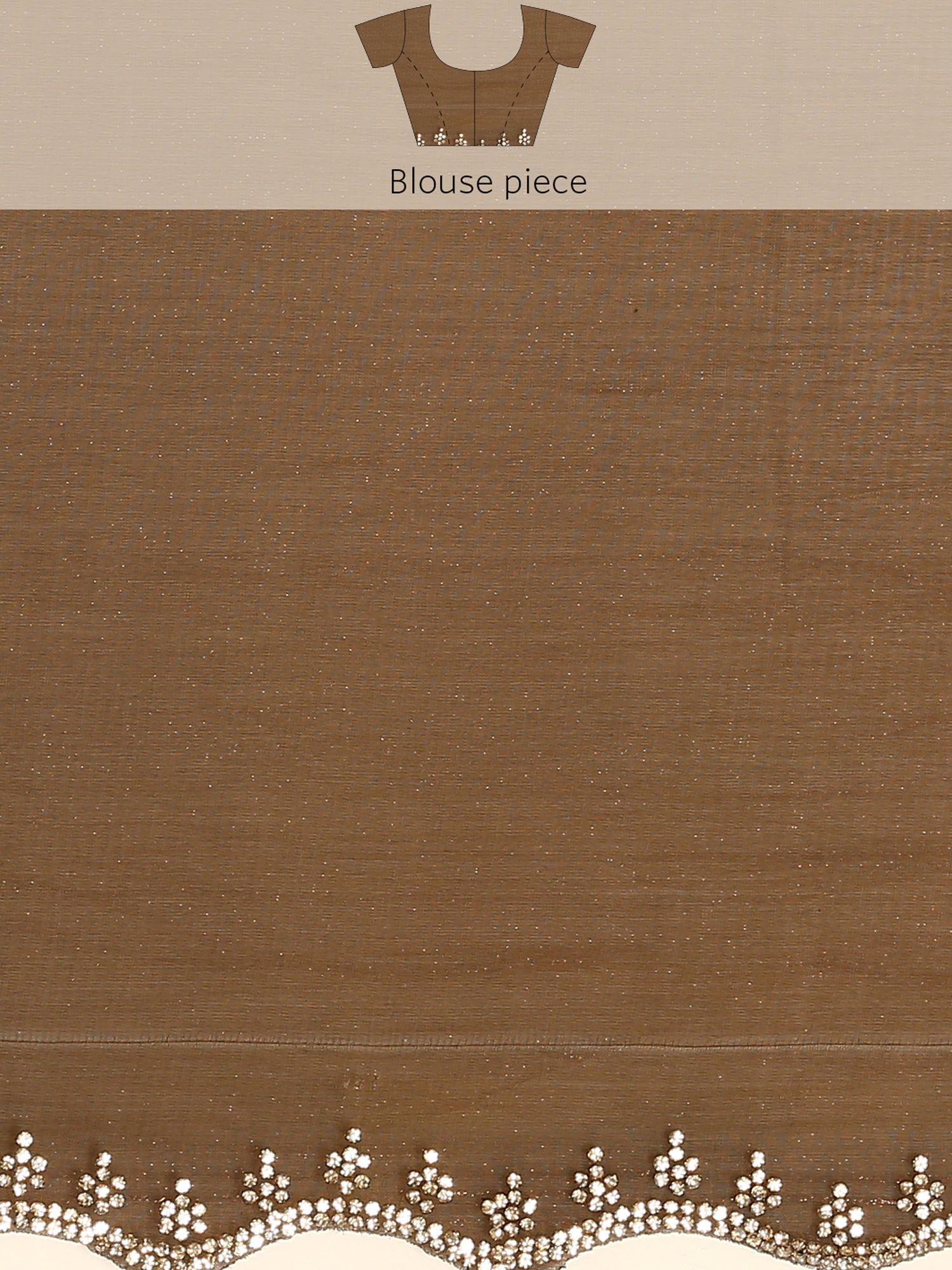 Elevate your traditional look with this elegant gold and rust floral printed Jimmy tissue saree, adorned with sparkling Swarovski embroidery. Its lightweight fabric ensures comfort throughout the day, while the intricate detailing enhances your outfit with a subtle shimmer. Perfect for festive occasions or special events, this saree blends classic charm with contemporary elegance to help you shine effortlessly.