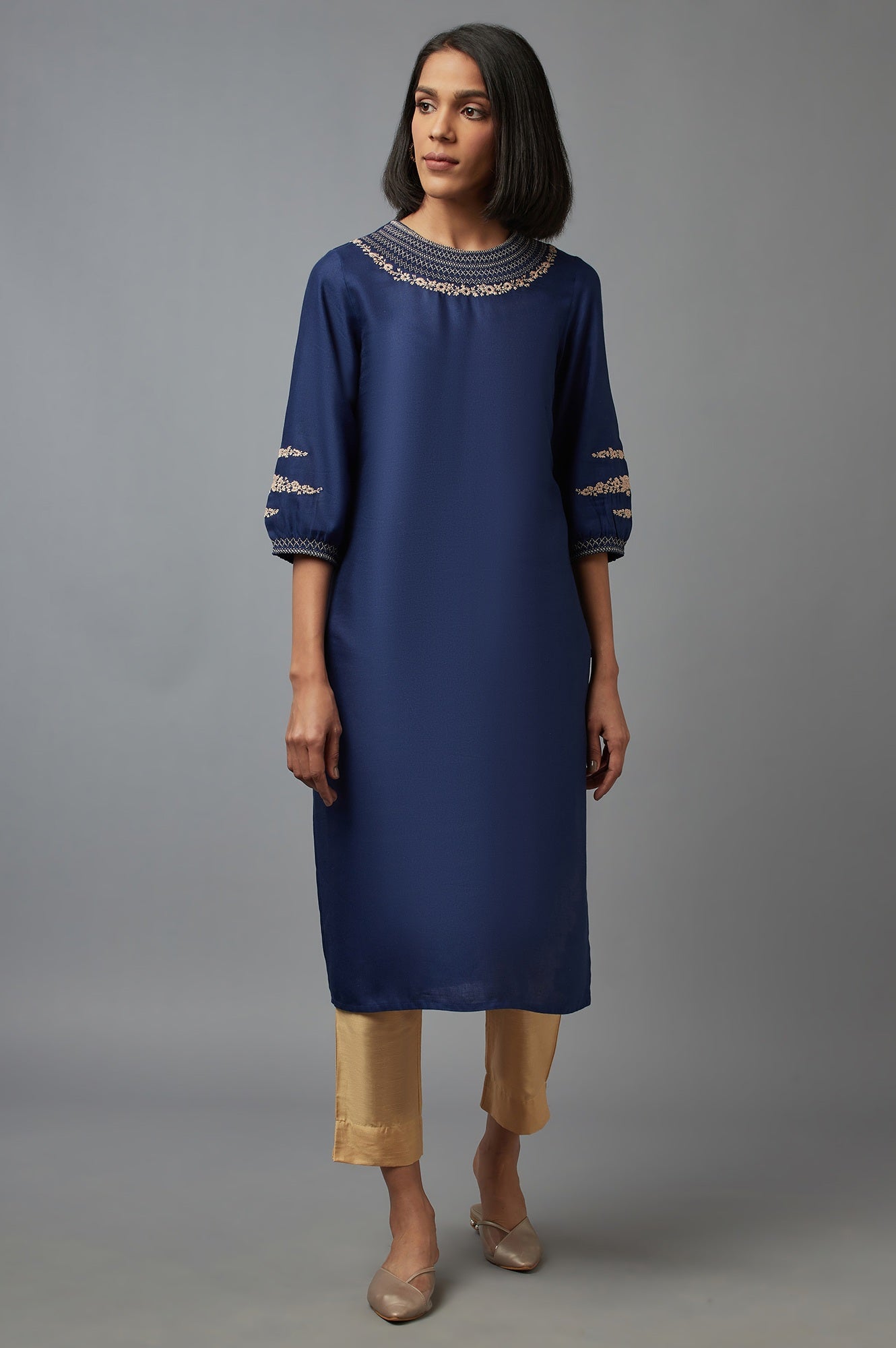 Softly tailored for summer elegance, these gold trousers for women feature a mid-rise elasticated waistband and a pleated front for added sophistication. The cropped hem with subtle side slits lends a modern touch, while the lightweight viscose fabric ensures breathable comfort. Perfect for festive gatherings or casual outings, these straight-leg trousers pair effortlessly with kurtas or tops. Designed for easy wear, they offer a versatile addition to your wardrobe.