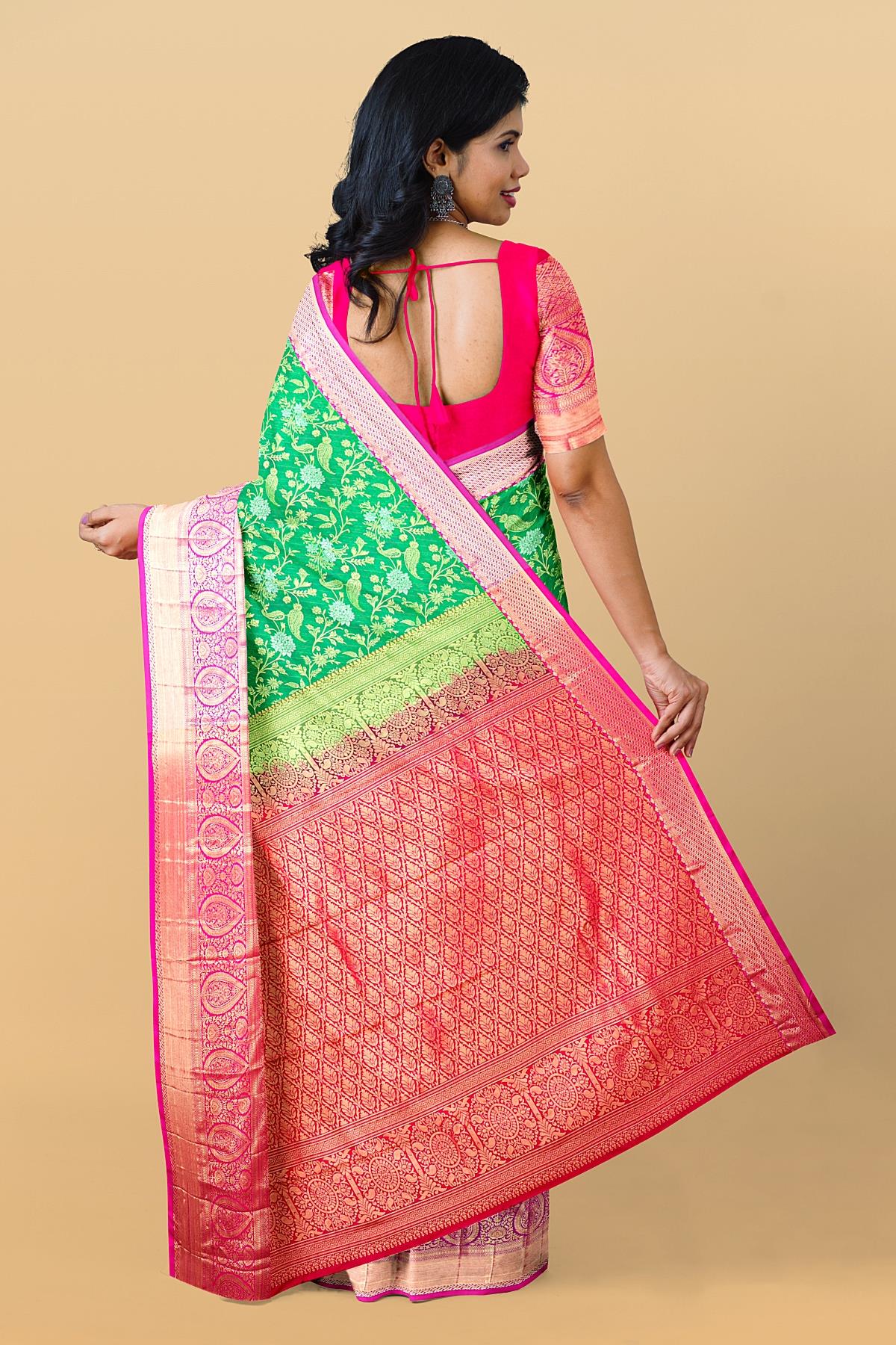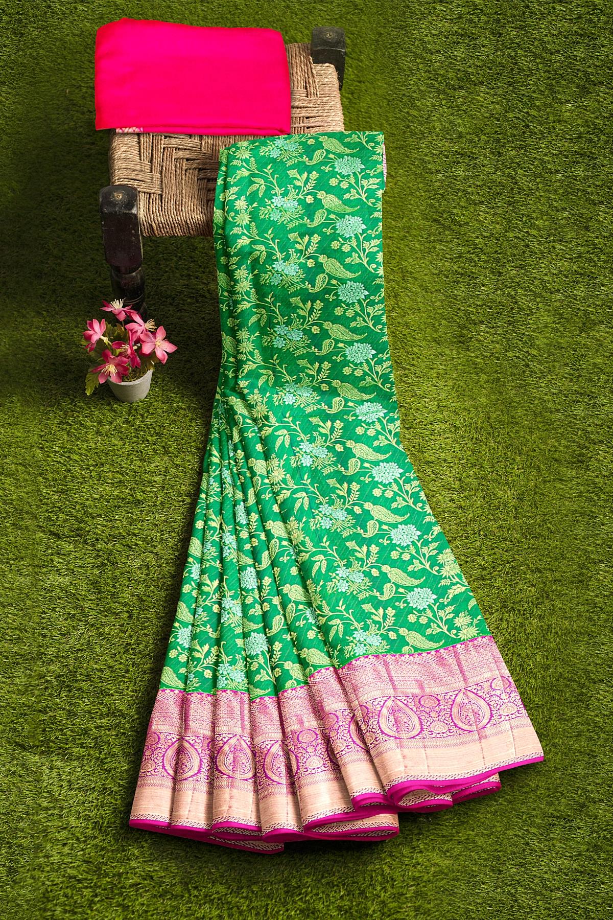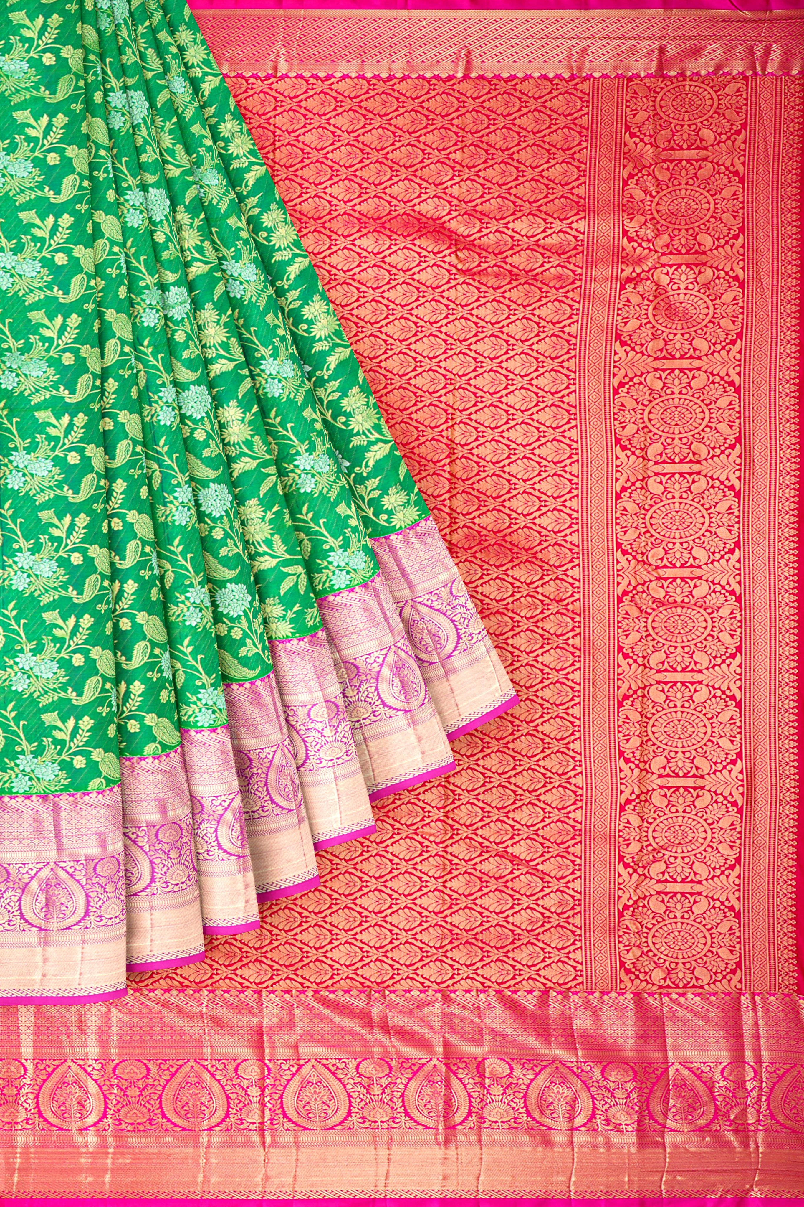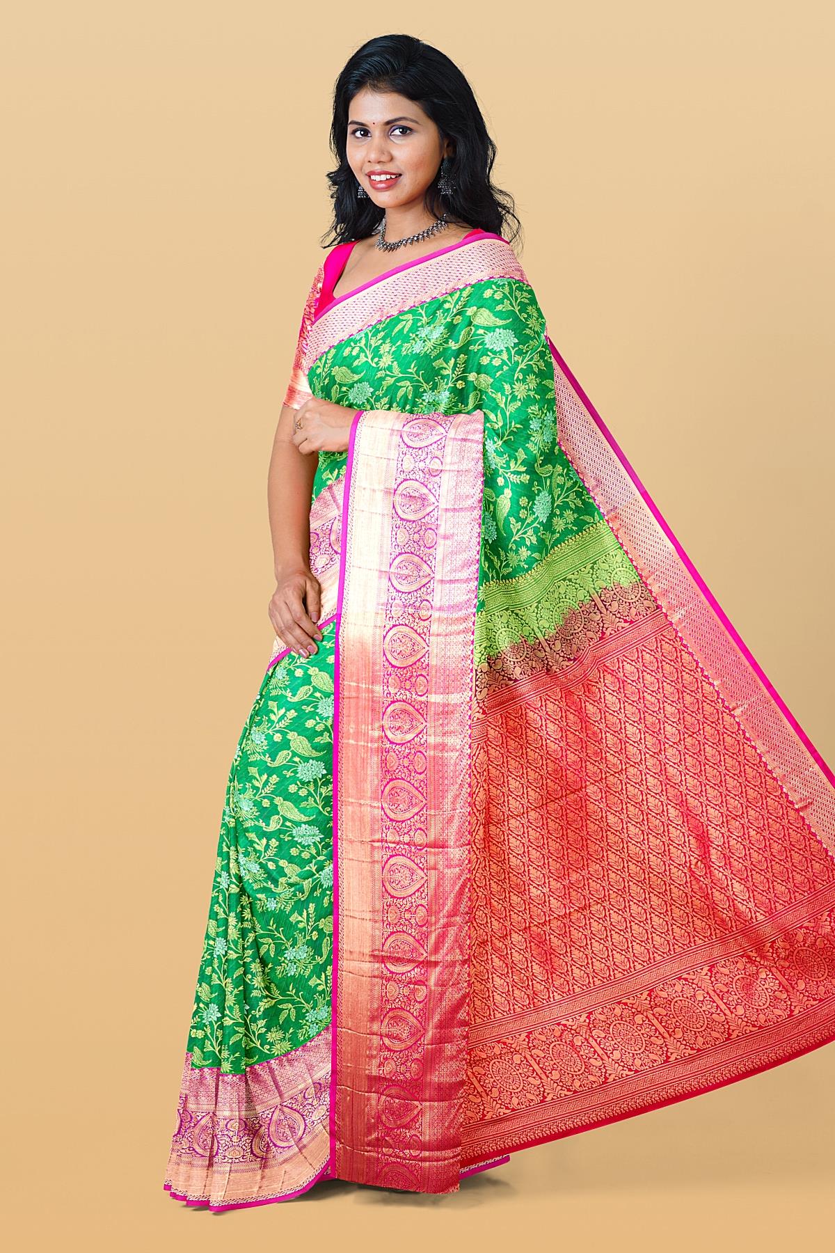 Latest GREEN FLORAL JAAL SILK BLEND Saree with CONTRAST ZARI border. This saree comes with PLAIN WITH BORDER SILK BLEND blouse.