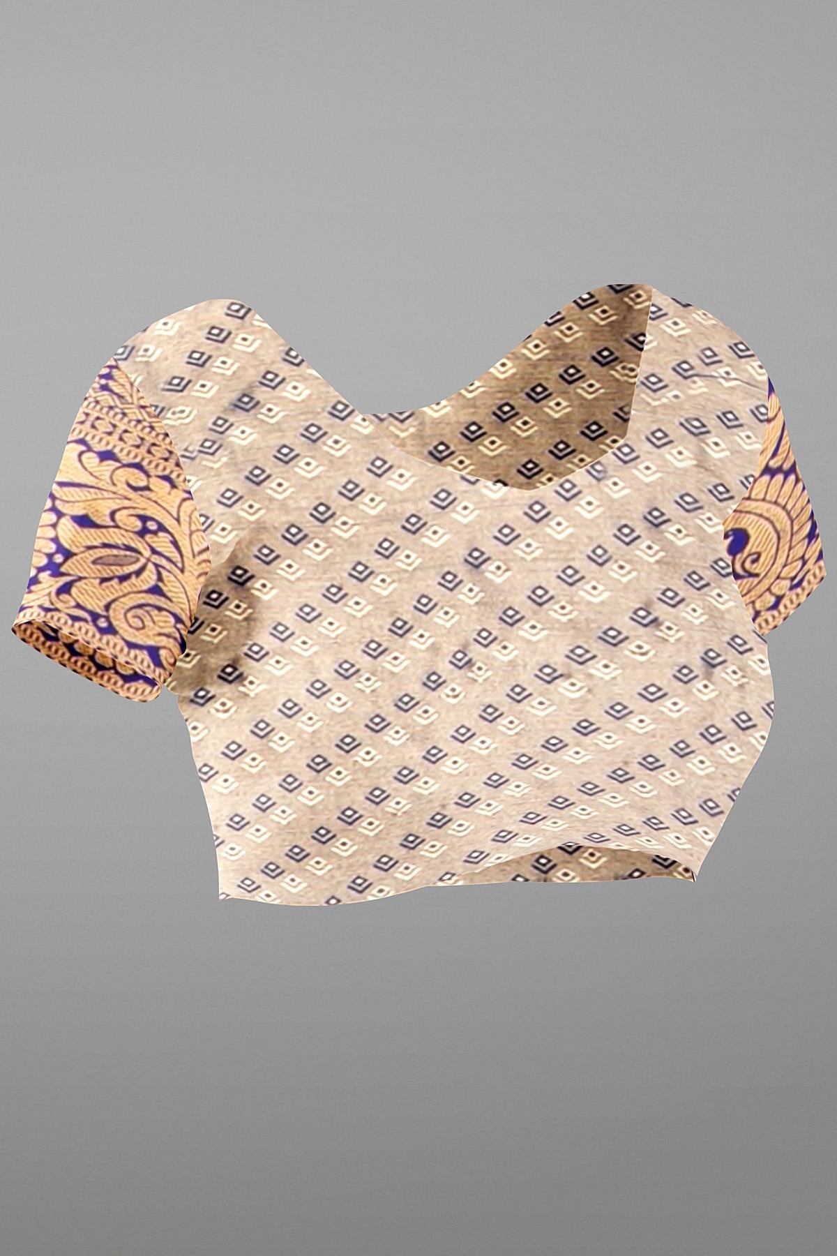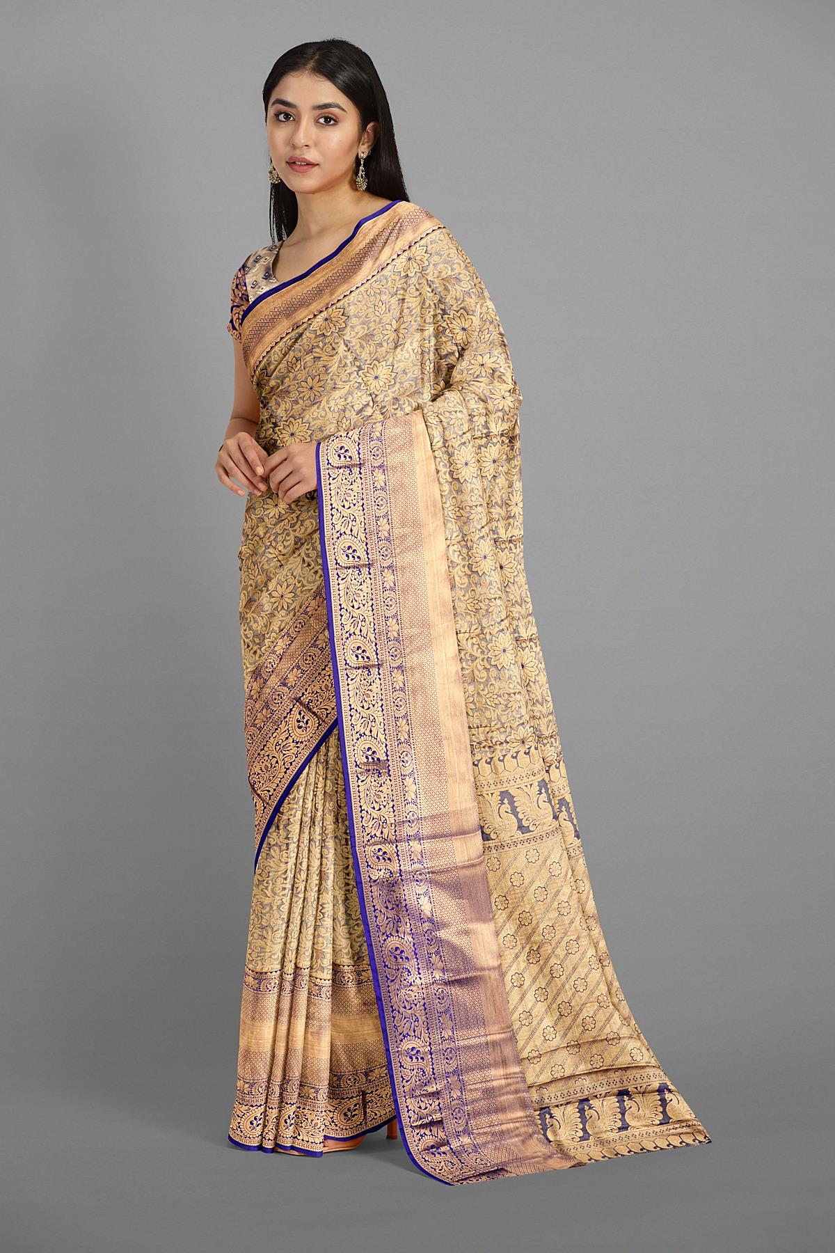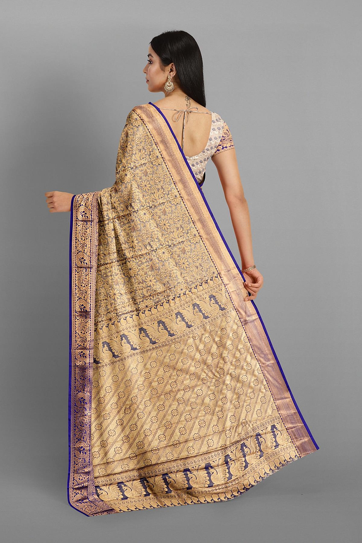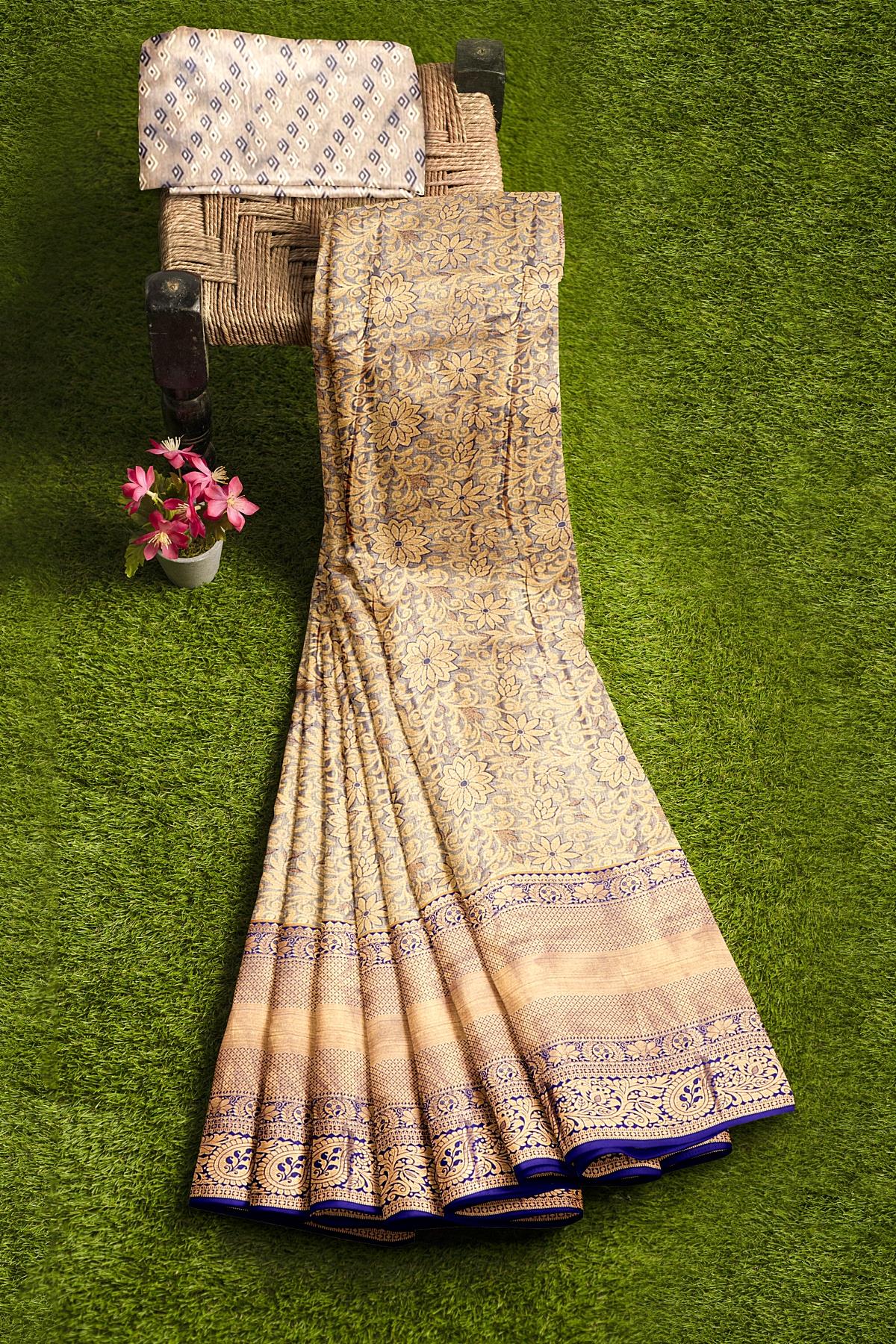 GREY and ROYAL BLUE FLORALS TISSUE SILK Saree with SEMI PATTU