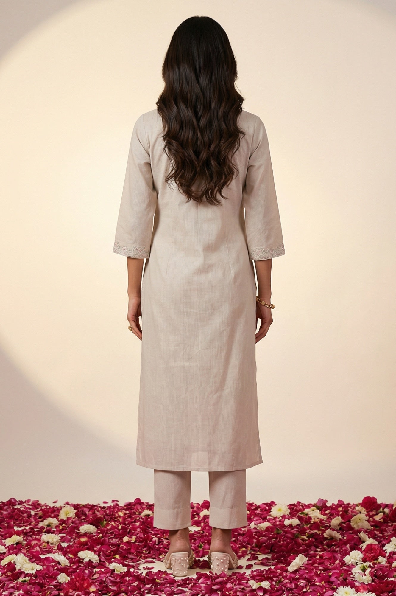 Refresh your ethnic wardrobe with this grey floral embroidered kurta by Aurelia. Crafted from a soft viscose blend, this straight-fit kurta offers a comfortable drape perfect for summer wear. It features a classic round neck with a notched slit, three-quarter sleeves, and intricate sequin thread work on the yoke and cuffs that adds a subtle shimmer. The calf-length silhouette with side slits pairs effortlessly with neutral trousers or leggings for a refined look. Ideal as casual wear or smart-casual office attire, this woven kurta combines traditional craftsmanship with modern ease. Hand wash gently to maintain the delicate embroidery and fabric quality.
