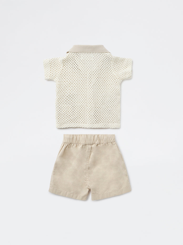 HOP Baby presents this white charming set for infant boys. The crochet-knit design features tropical motifs and is designed with a camp collar, a button-up front and short sleeves.Light beige shorts feature an elasticated waistline with adjustable drawstrings for an easy fit. Crafted from soft cotton fabric, the set keeps baby skin comfortable while offering a light, breathable feel suited for warm days and easy movement.