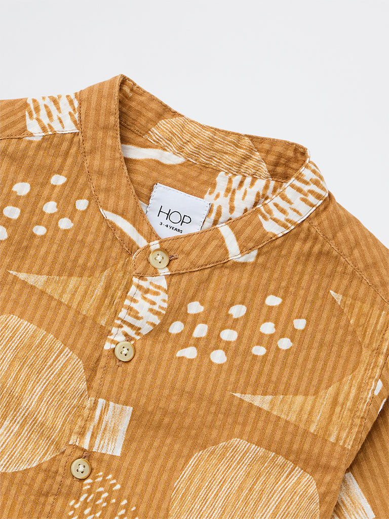 This mustard shirt from HOP Kids is crafted from pure cotton for soft, breathable comfort. Featuring an all-over print with a subtle textured finish, it is styled with a neat band collar, a button-up front and short sleeves.