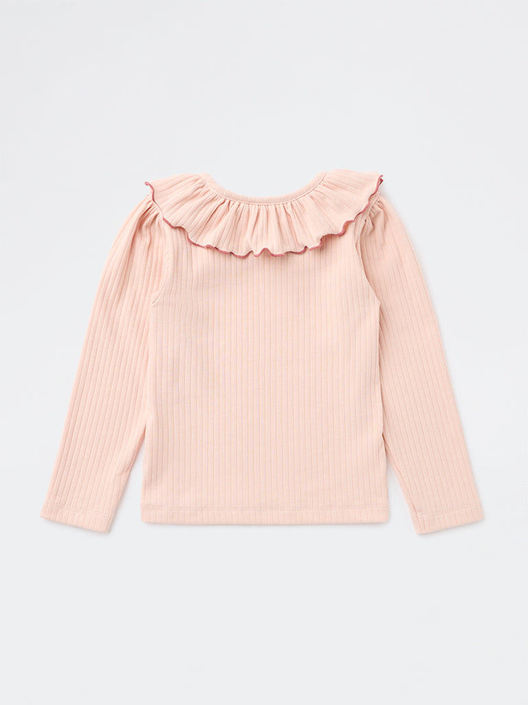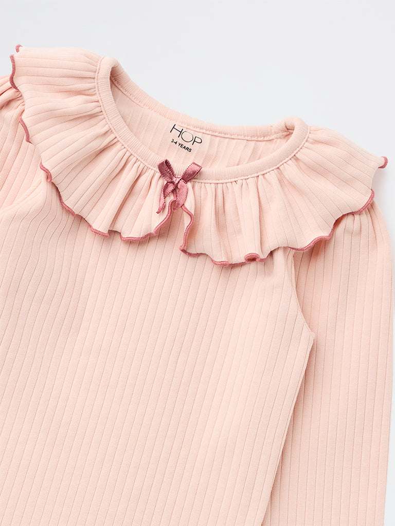 HOP Kids introduces a charming everyday essential with delicate detailing. This pink top is crafted from a soft cotton-blend fabric with a fine ribbed texture for added depth. Designed with a round neck, it features a frilled collar edged with contrast piping, complemented by long sleeves for comfortable coverage. A bow detail at the front completes the look, making it perfect for layering or standalone wear.