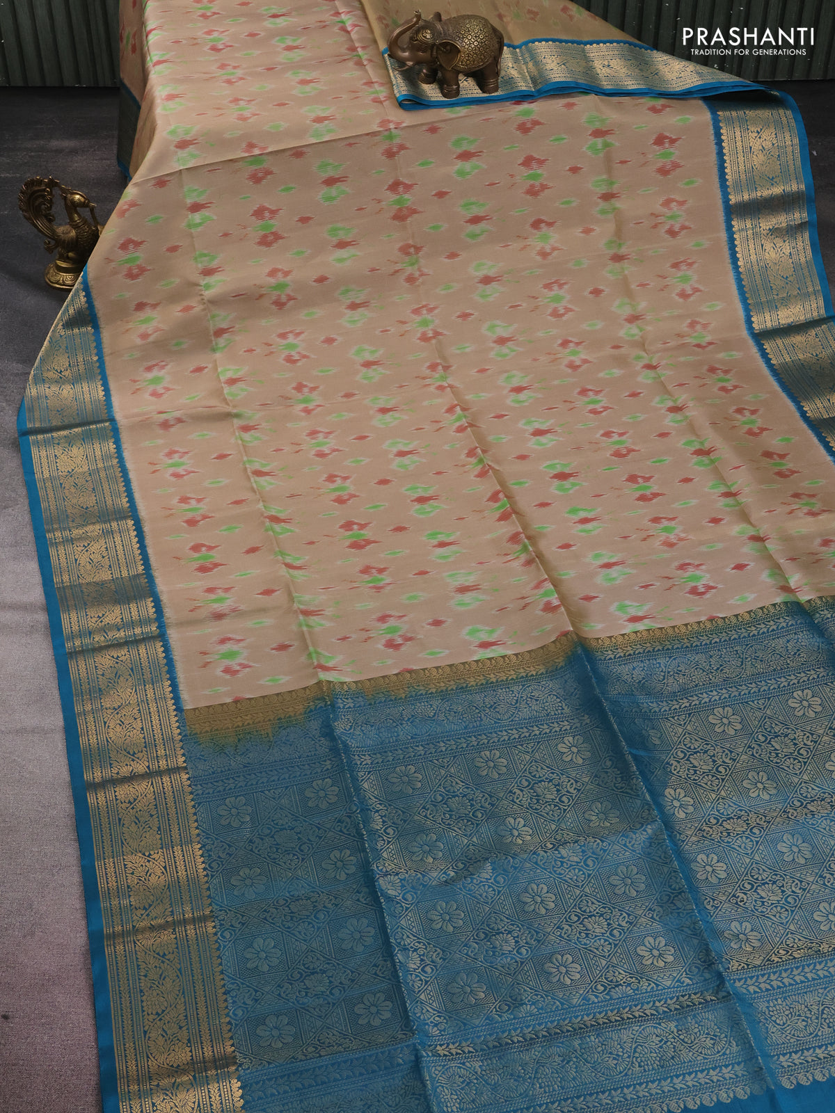 Ikat soft silk saree beige and cs blue with allover ikat weaves and zari woven border