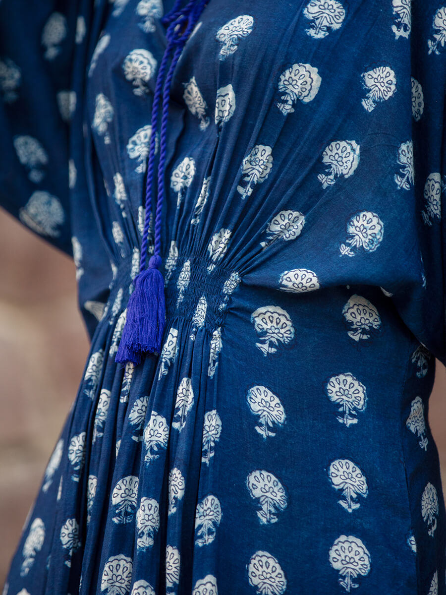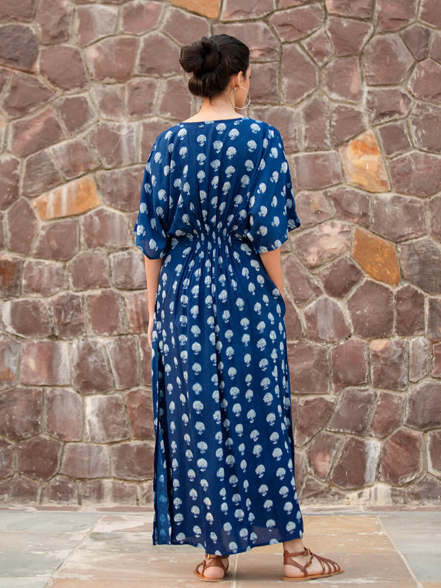 Jheel Indigo Printed Modal Kaftan Maxi Dress