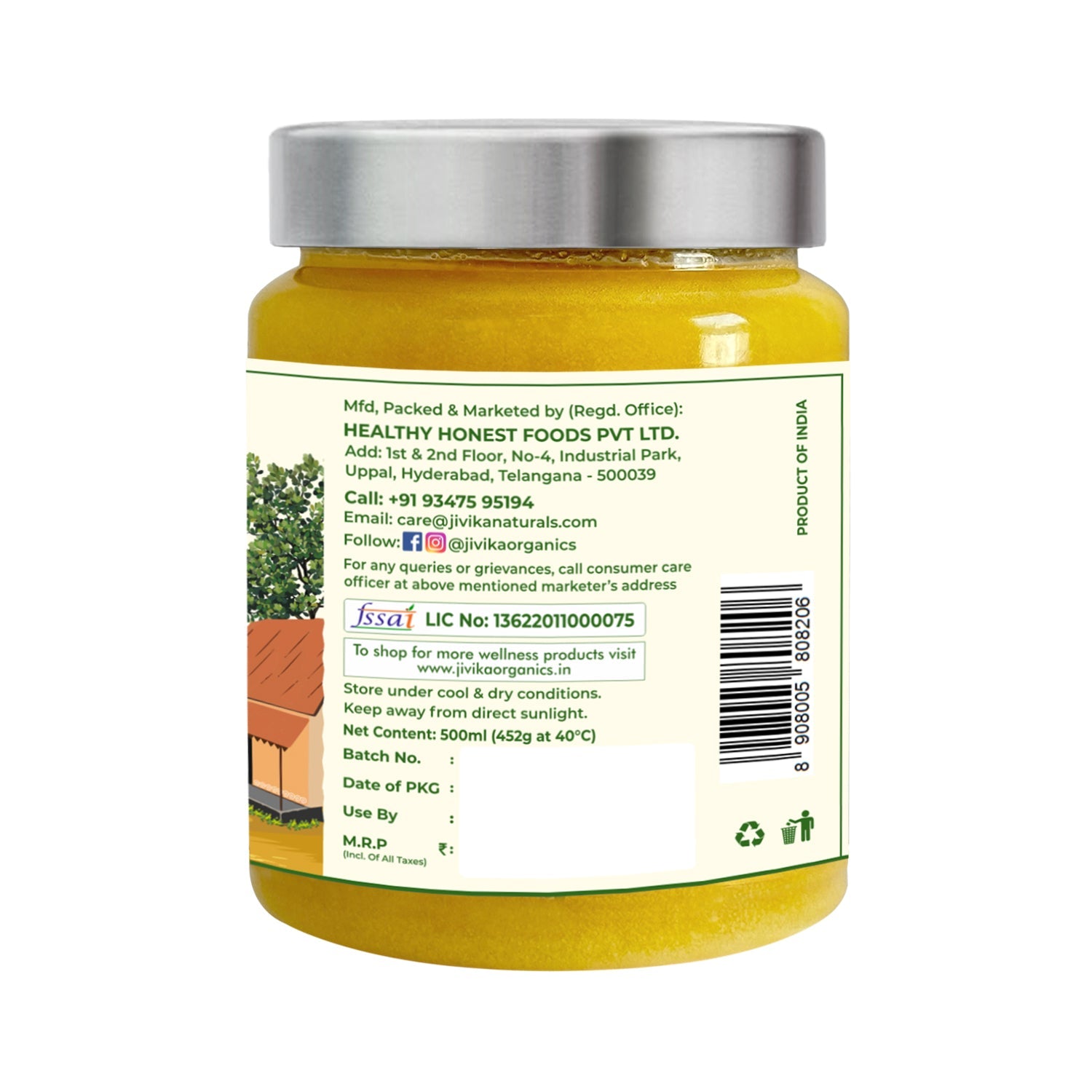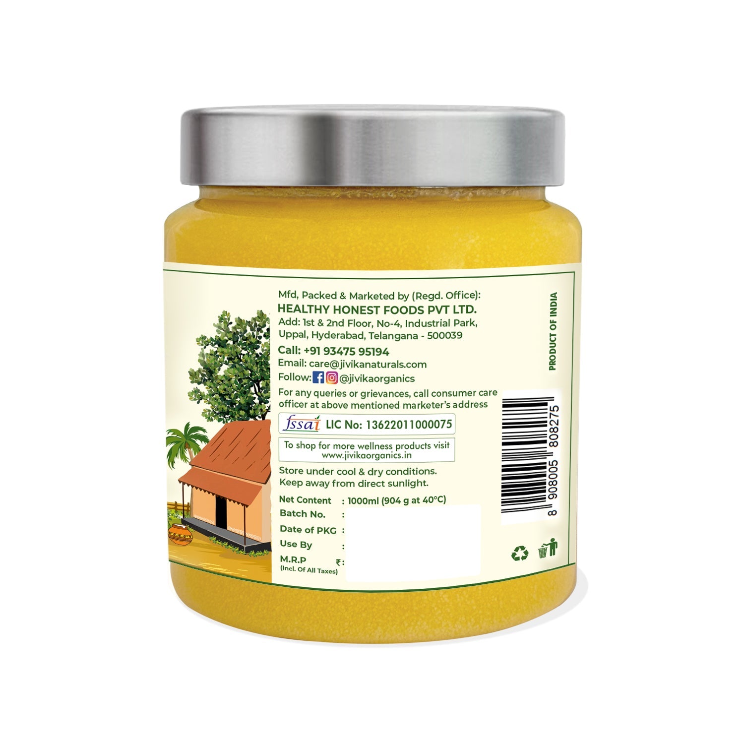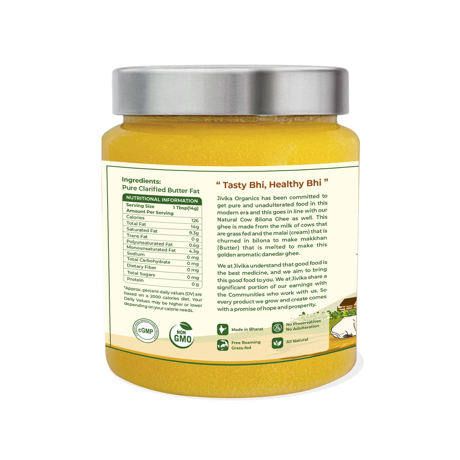 Jivika Organics has been commited to get pure and unadulterated food in this modern era and goes in line with our Natural Cow Bilona Ghee as well. This ghee is made from the milk of cows that are grass fed and the malai (cream) that is churned in bilona to make makkhan (Butter) that is melted to make this golden aromatic danedar ghee.
