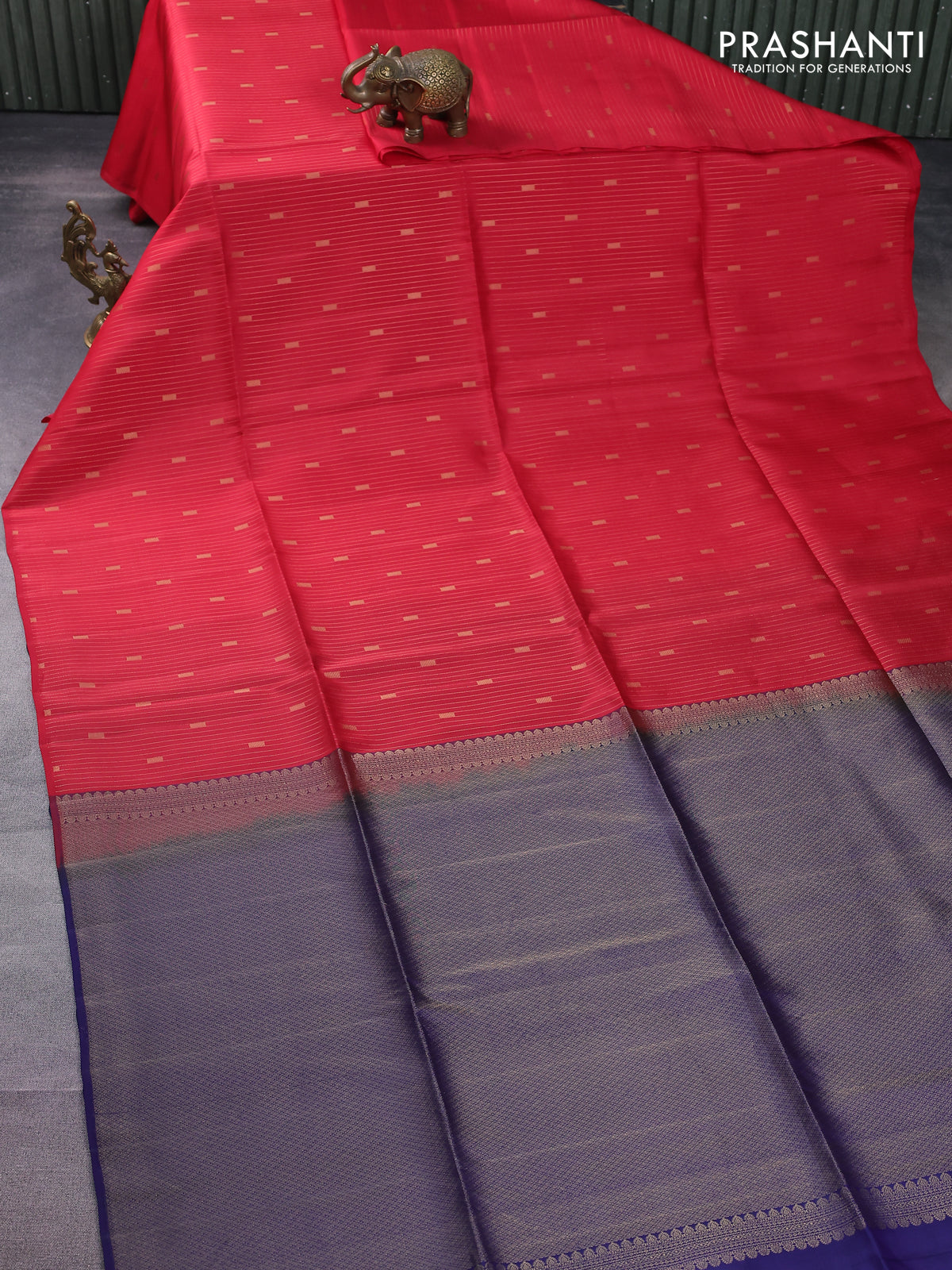 Kanchipuram soft silk saree red and blue with allover zari weaves in borderless style