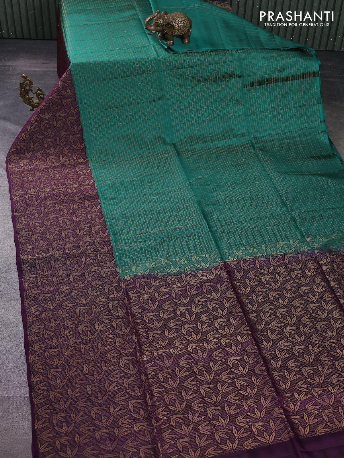 Kanchipuram soft silk saree teal green and purple with allover zari woven brocade weaves and long zari woven border
