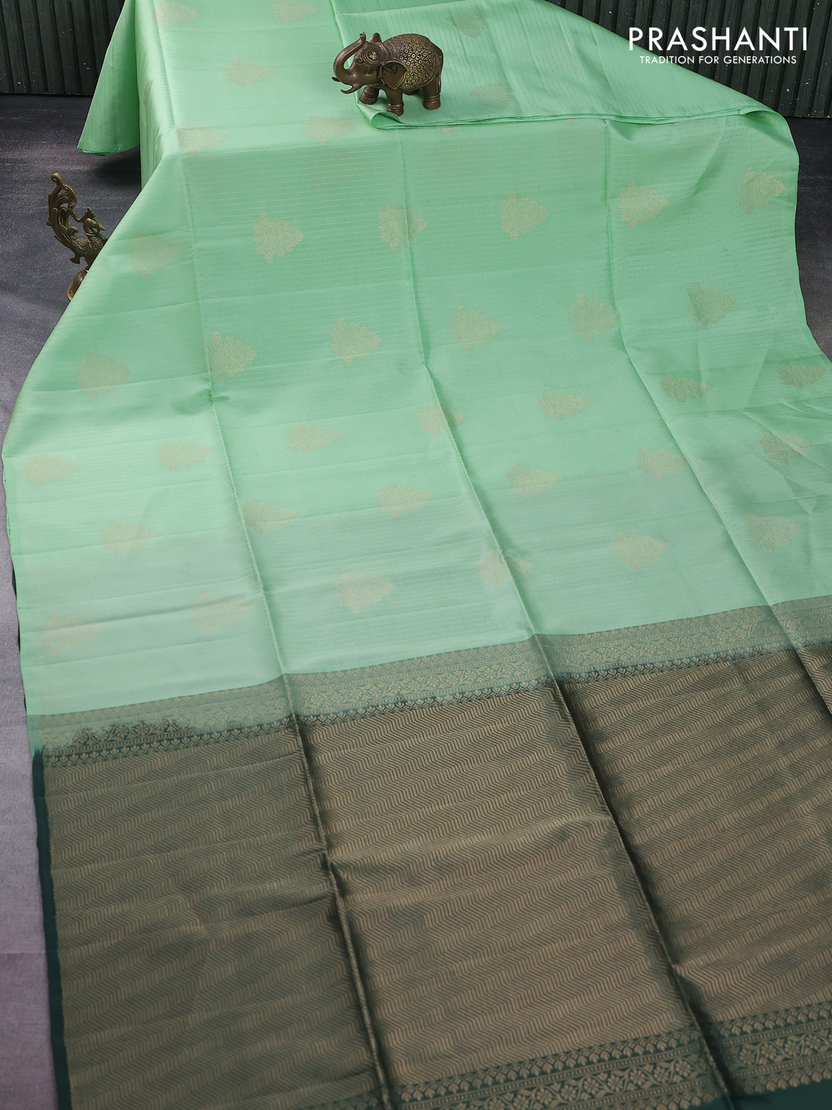 Kanchipuram soft silk saree teal green shade and bottle green with allover zari weaves in borderless style