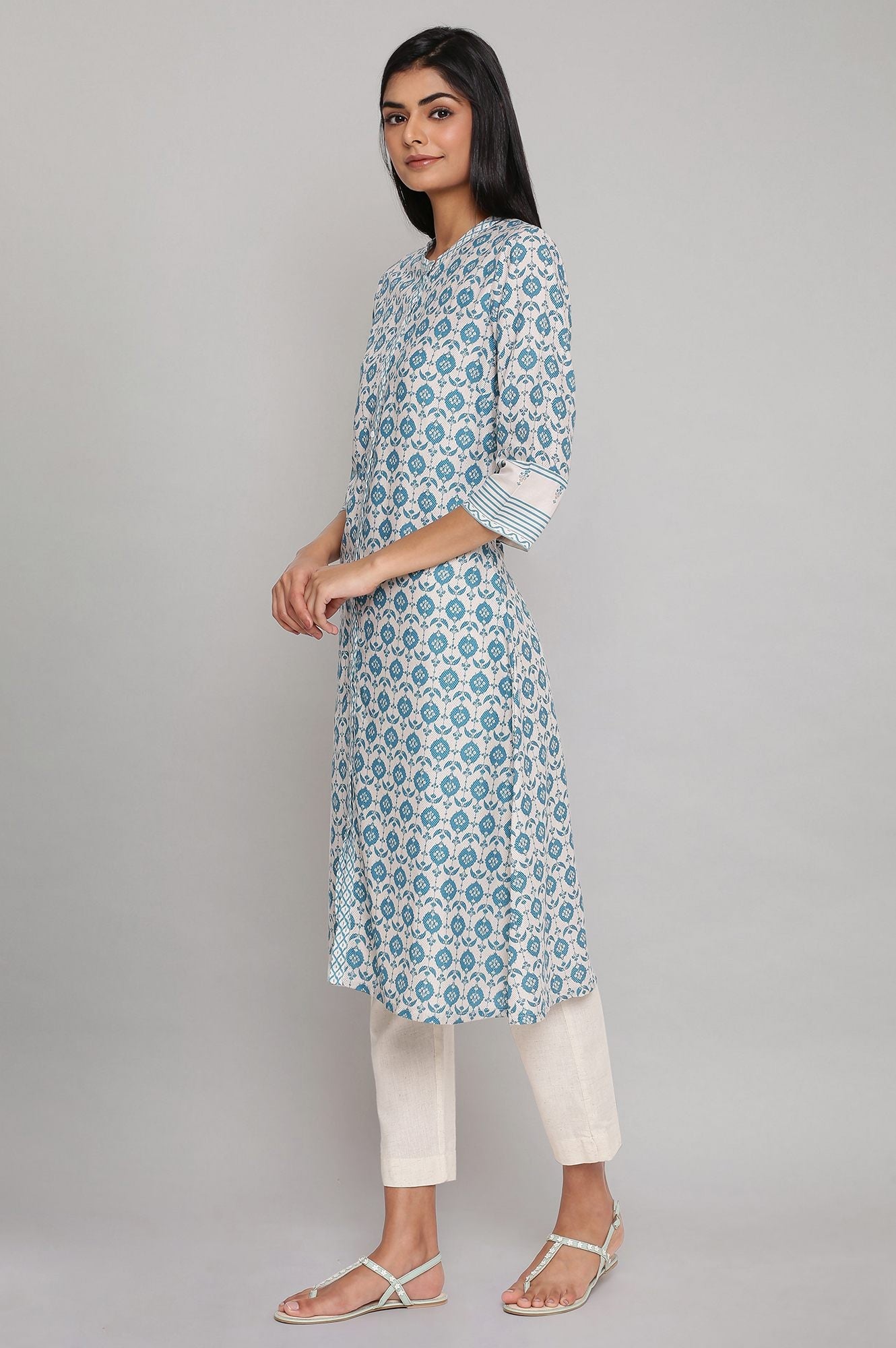 Elevate your ethnic wardrobe with this stunning blue kurta, perfect for casual occasions. Crafted using a woven construction technique, this three-quarter sleeve kurta showcases a beautiful floral print that adds a touch of elegance to your look. The v-neck design enhances its appeal, while the straight silhouette ensures a flattering fit for various body types. Made from 100% viscose, this rayon kurta offers comfort and breathability, making it ideal for all-day wear. The ethnic-inspired design combines traditional elements with contemporary style, allowing you to effortlessly blend fashion and culture. Whether you're attending a family gathering or a casual outing with friends, this versatile kurta is sure to make a lasting impression. Its soft and lightweight fabric drapes beautifully, creating a graceful silhouette that moves with you. The intricate floral print adds a feminine touch, making it a perfect choice for those who appreciate subtle yet eye-catching details in their ethnic wear.