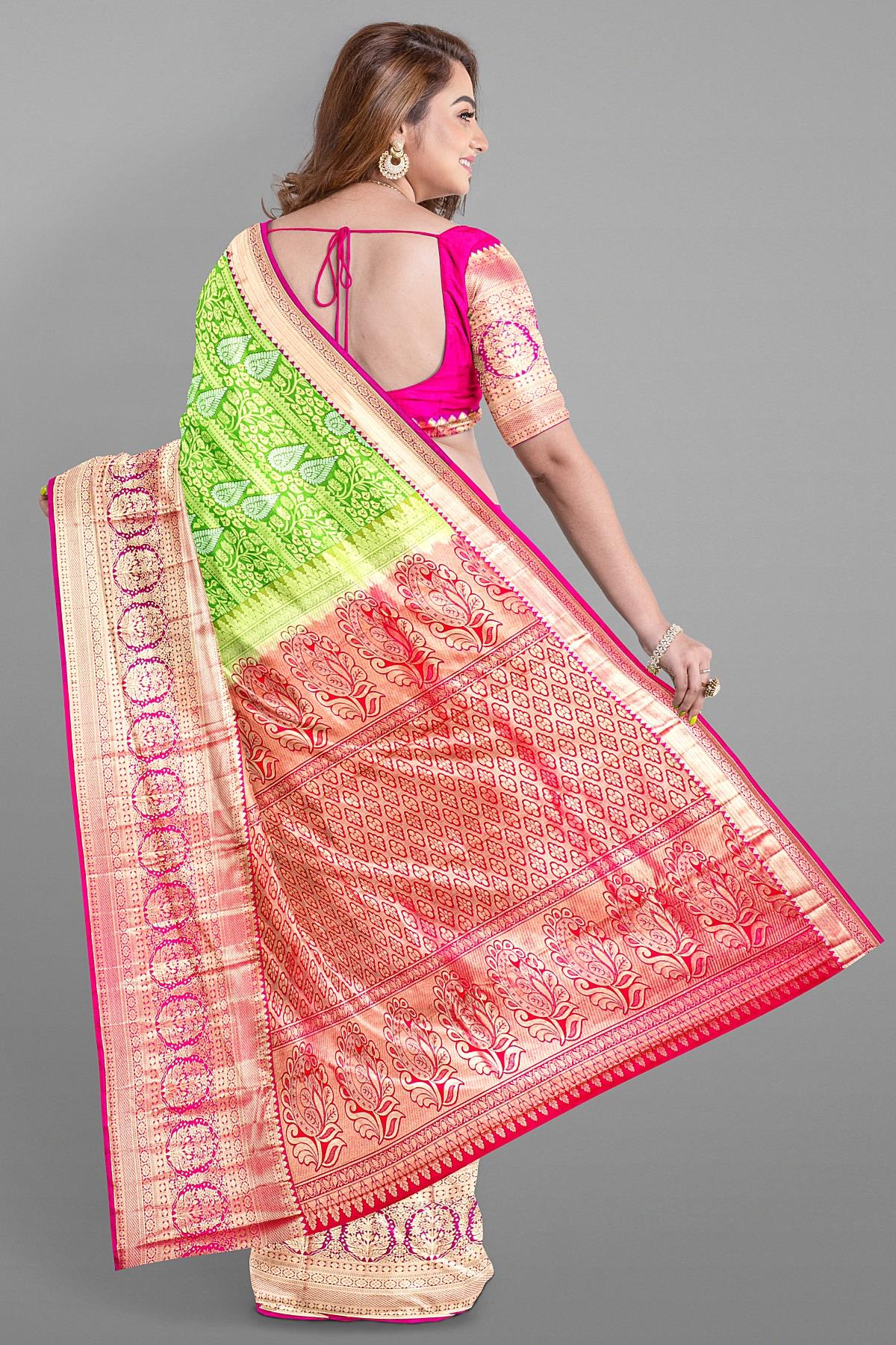 LIGHT GREEN and LIGHT PINK FLORAL JAAL SILK BLEND Saree with SEMI PATTU