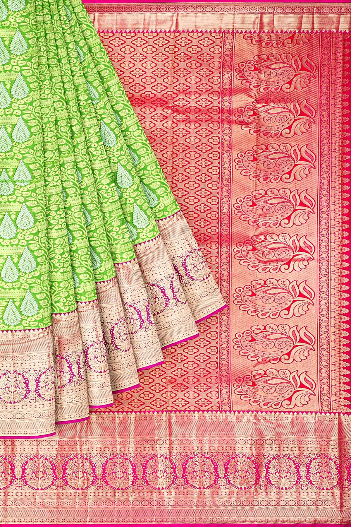 Latest LIGHT GREEN FLORAL JAAL SILK BLEND Saree with CONTRAST ZARI border. This saree comes with PLAIN WITH BORDER SILK BLEND blouse.